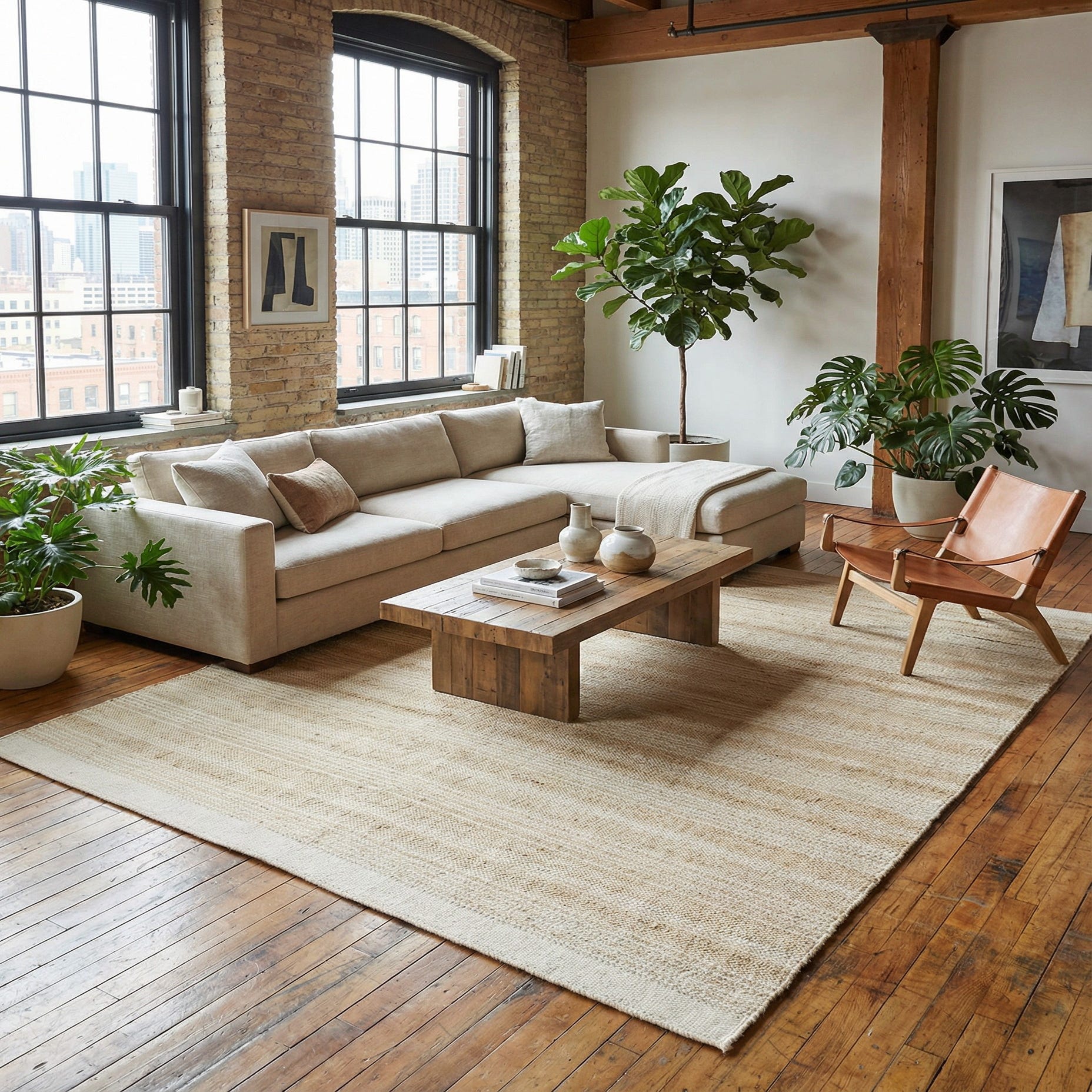 This piece works well in relaxed, layered interiors where natural materials are focal points: pair it with light wood furniture and linen upholstery in a coastal or Scandinavian living room, place it beneath a rustic dining table to add grounding texture, or use it in a bedroom to introduce warm neutrals without overpowering soft textiles. It complements rattan, ceramics, and muted metallic accents and is a straightforward choice for transitional, boho, or modern farmhouse schemes.