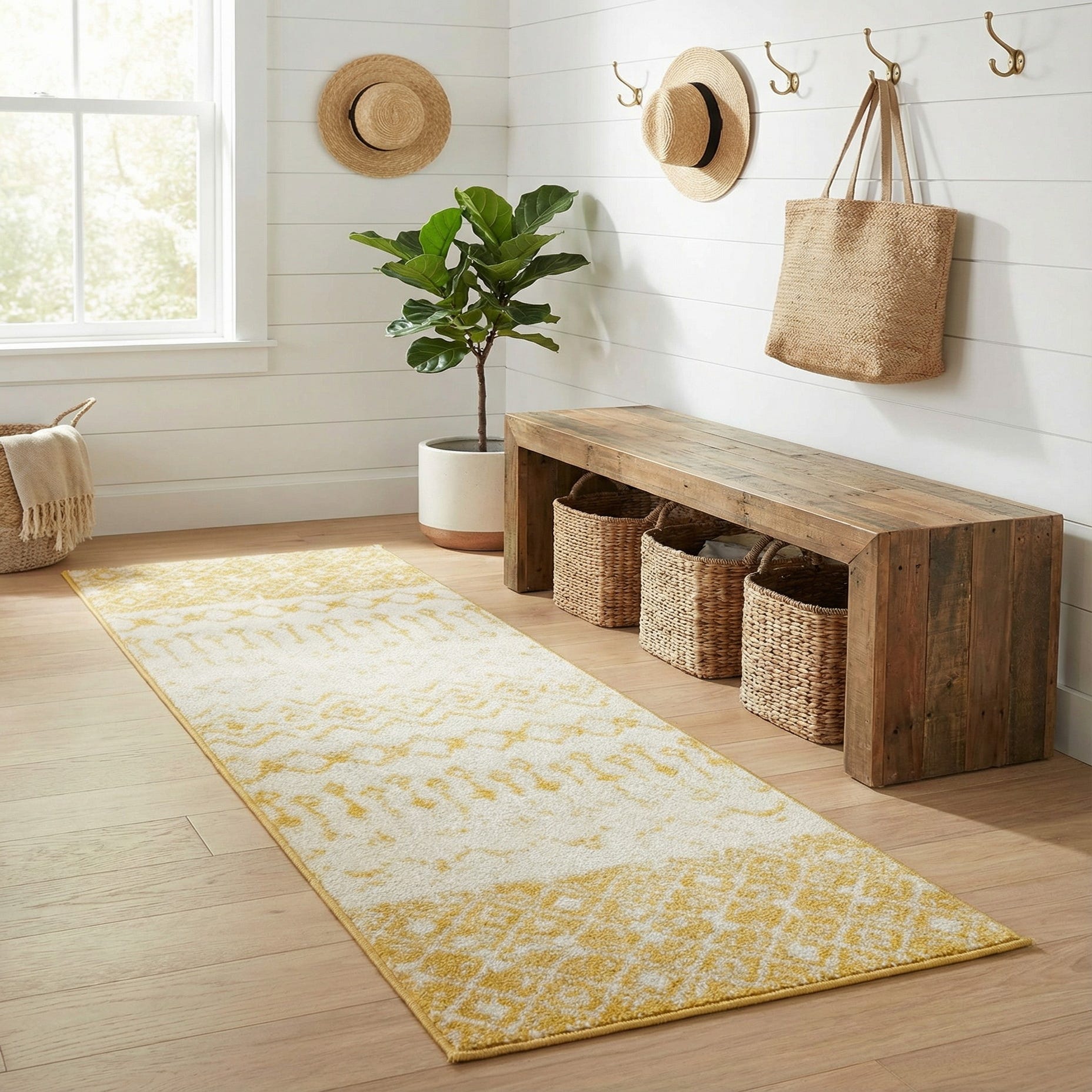 This runner works well in narrow or transitional spaces that could use a touch of warmth, such as hallways, entryways, or alongside kitchen islands. It pairs nicely with light wood floors, white or cream cabinetry, and brass or matte black accents, and complements styles from modern farmhouse to casual bohemian and transitional interiors. Layer it with natural-fiber rugs or keep it solo to bring a soft, sunny accent to your circulation zones.