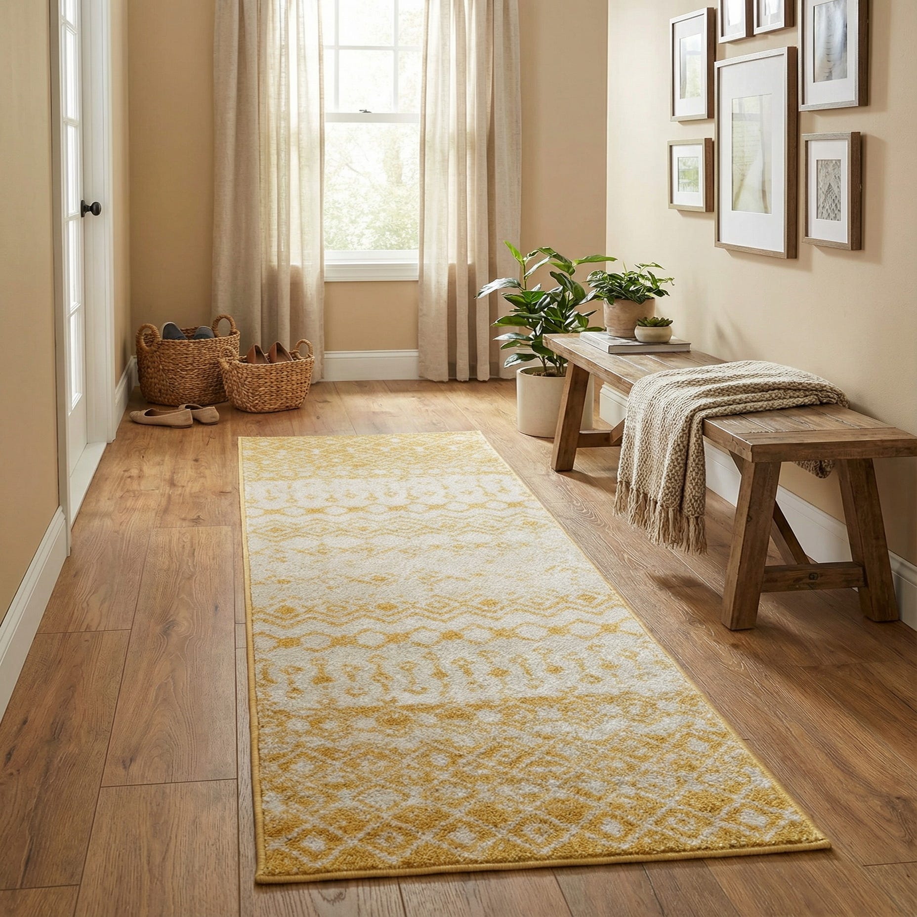 Ideal for hallways, entryways or alongside a bed, this runner brings a cheerful accent without overpowering the room. It pairs naturally with light wood flooring, white or warm neutral walls, and mixed-metal accents like brass or matte black; it also complements mid-century and modern farmhouse furnishings or a relaxed boho scheme. Use it to brighten a narrow kitchen aisle, define a foyer pathway, or add a soft, patterned layer to a long, open corridor.