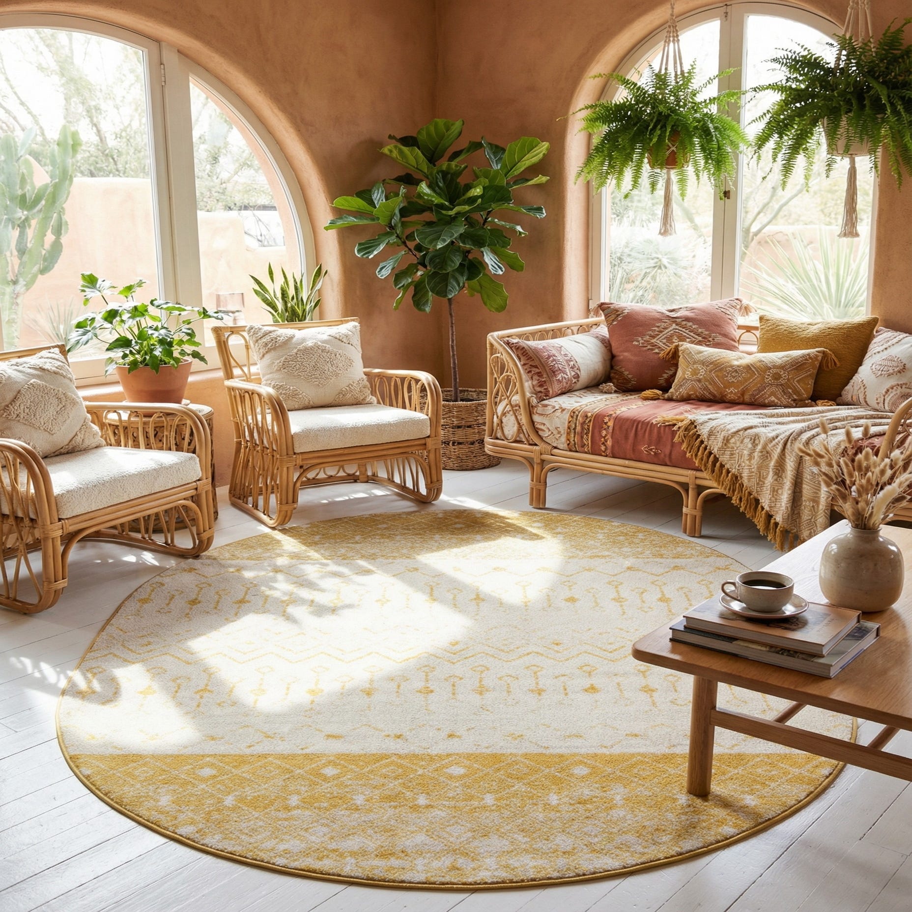 This rug pairs well with relaxed, layered interiors — think a sunlit living room with natural wood furniture, a cozy reading nook with rattan and linen accents, or an entryway that benefits from a welcoming, bright focal point. It also complements contemporary and transitional schemes when combined with navy or charcoal accent pieces, brass details, or simple mid-century silhouettes.