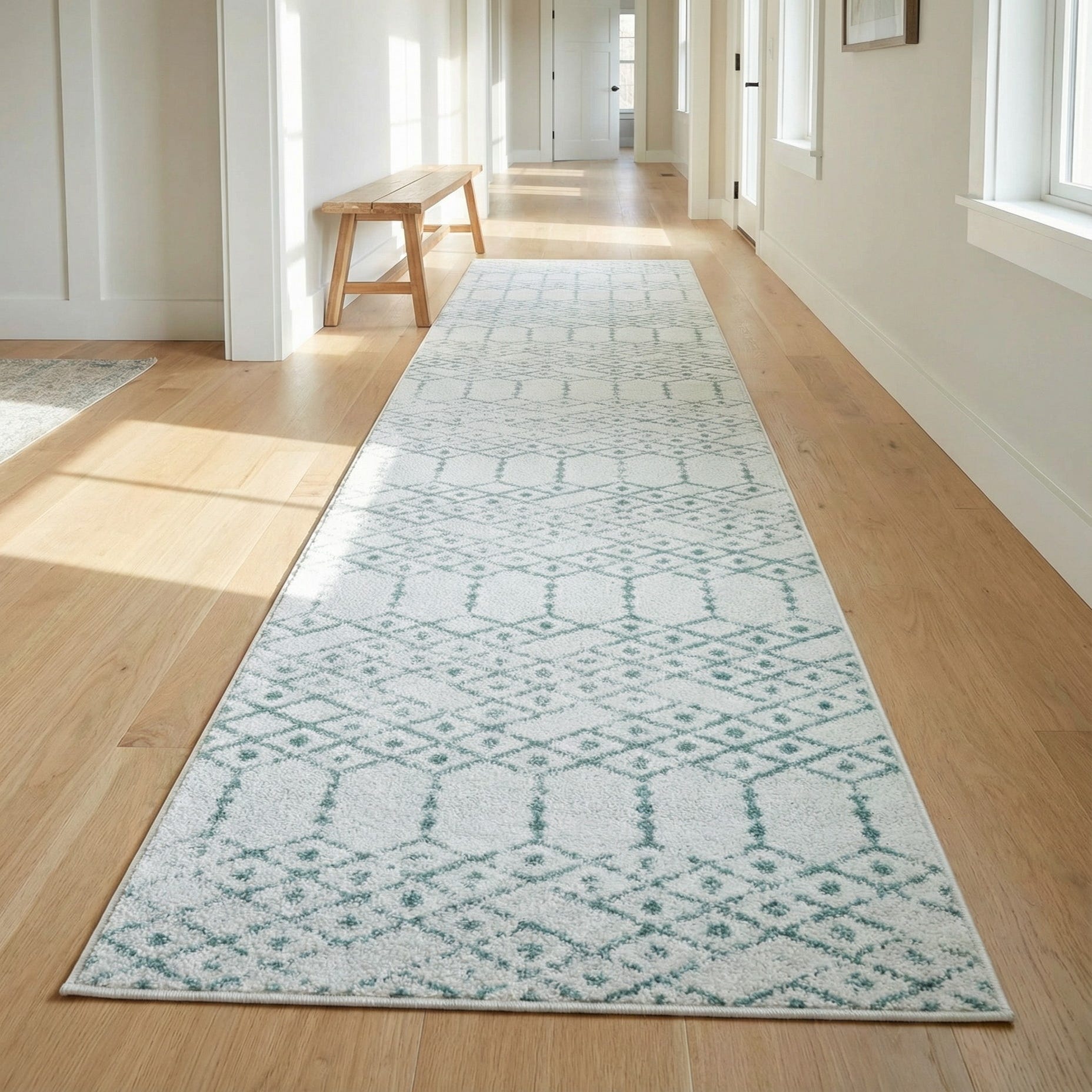 This runner works well in hallways, entryways, or alongside beds where a light, airy look is desired. It pairs naturally with light wood tones, soft greys, linen upholstery, or coastal-inspired decor, and also complements transitional and modern farmhouse interiors that favor muted color palettes and understated pattern.