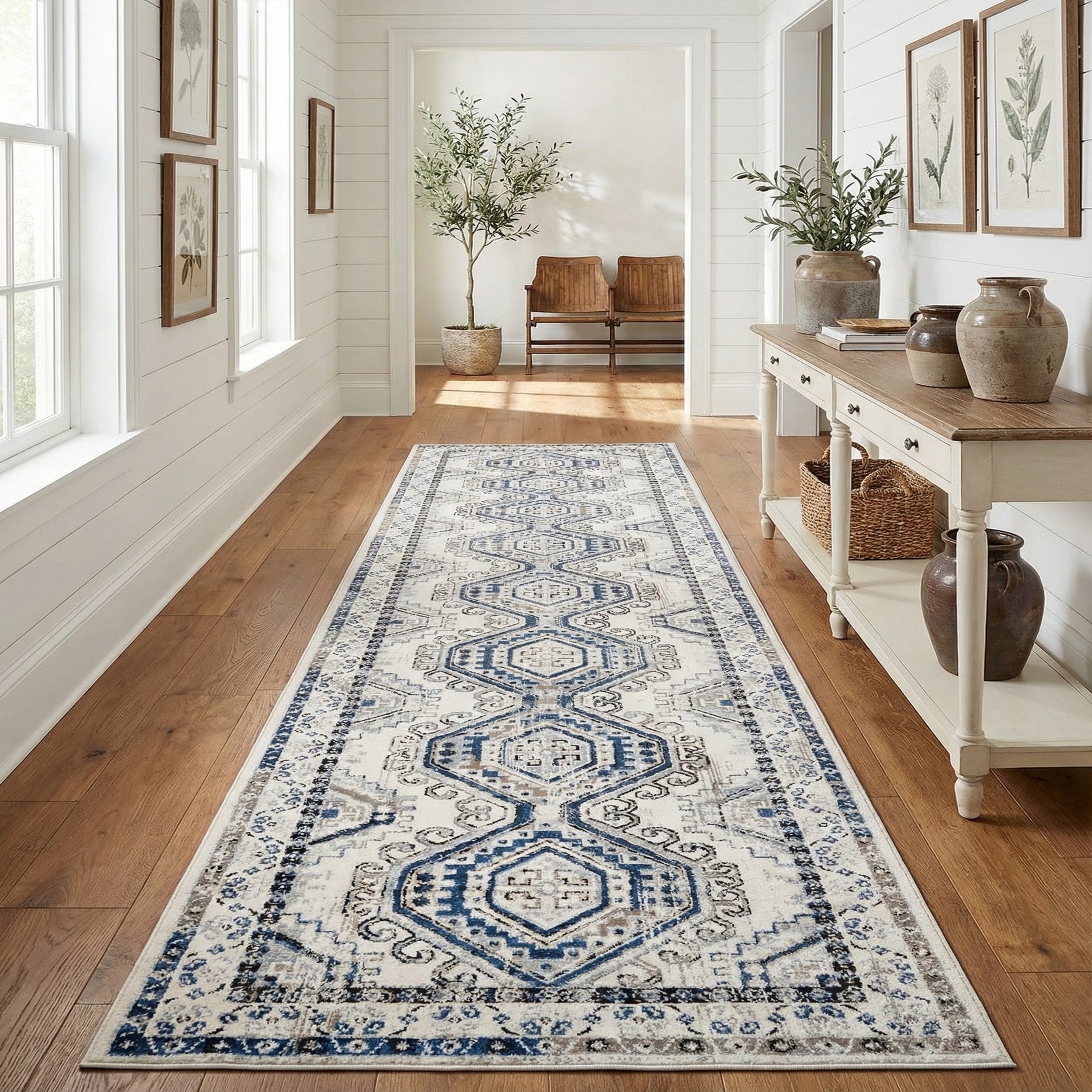 A 16 ft runner rug with a traditional Southwestern tribal pattern in shades of blue, ivory, and cream, ideal for a hallway.