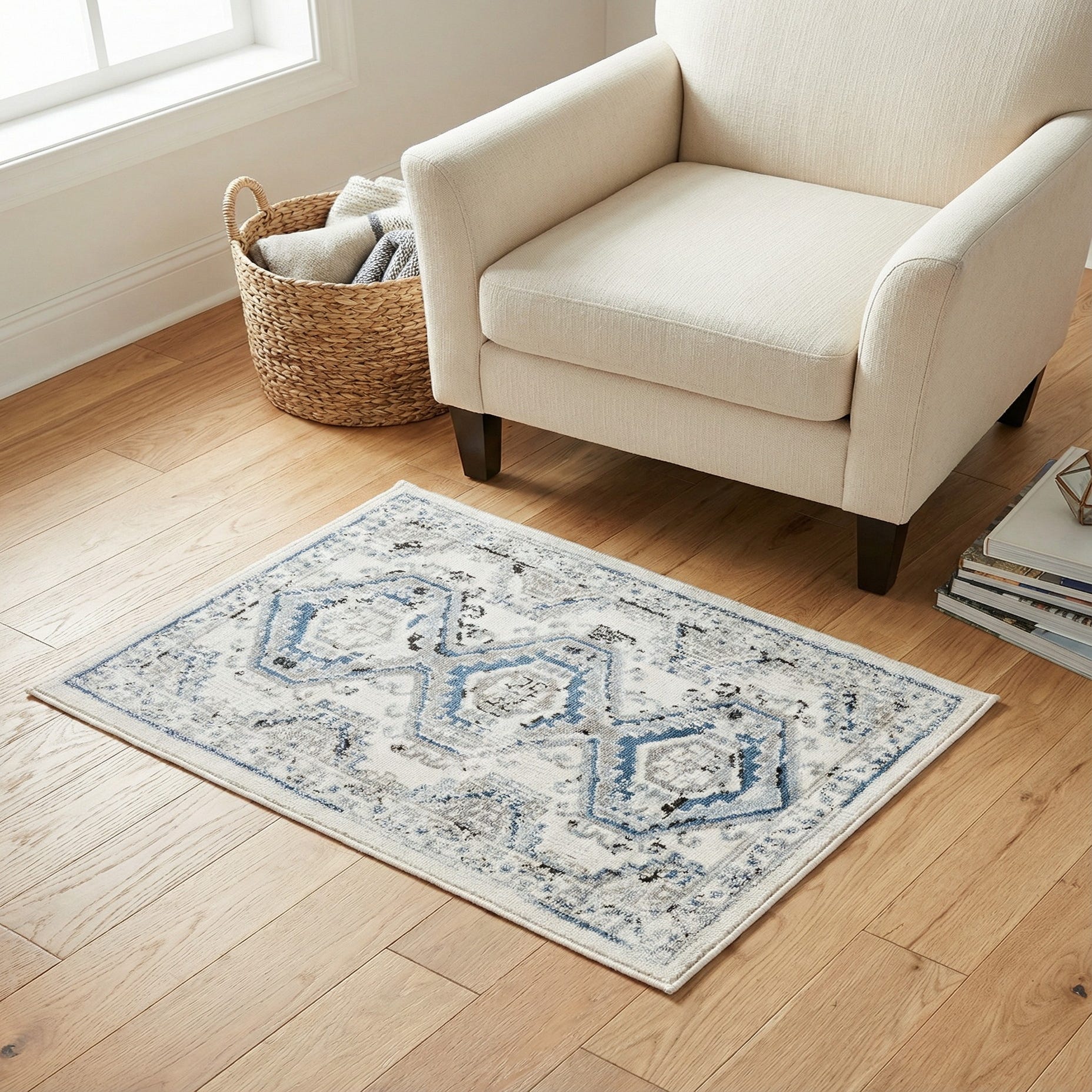 This piece works well anywhere you want a touch of casual elegance: layered under a small seating area, placed in an entry or hallway, beside a bed, or in a powder room or kitchen nook. The cool blues and neutral grays pair nicely with coastal, cottage, and transitional palettes, and it complements natural woods, white-painted furniture, and simple metal accents.