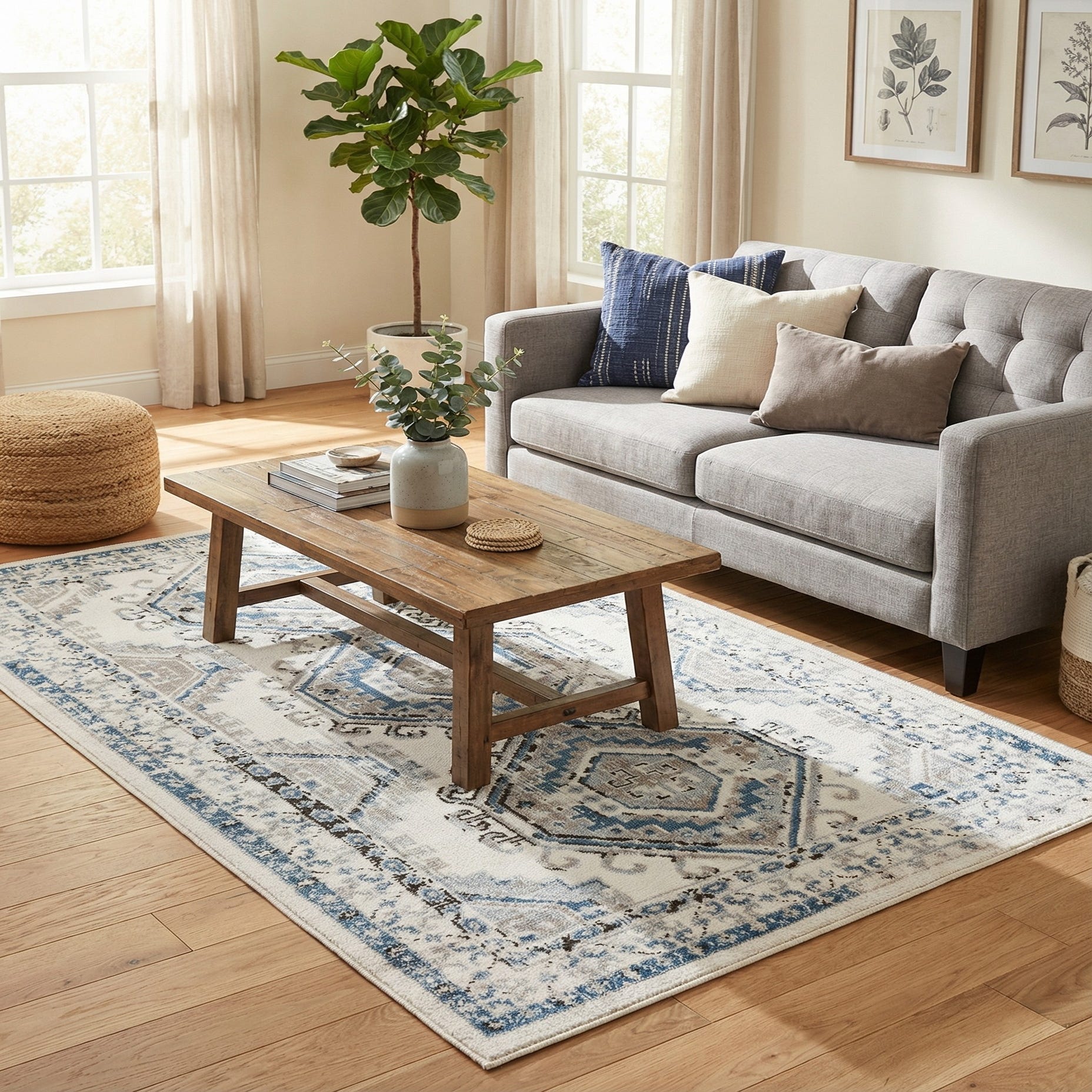 This rug pairs naturally with light-wood or whitewashed furnishings, navy or gray upholstery, and neutral linens for a calm, layered look. It works well in an entryway, a small seating area, beside a bed, or in a kitchen nook where the compact scale and cool color palette add visual interest without overwhelming the space.