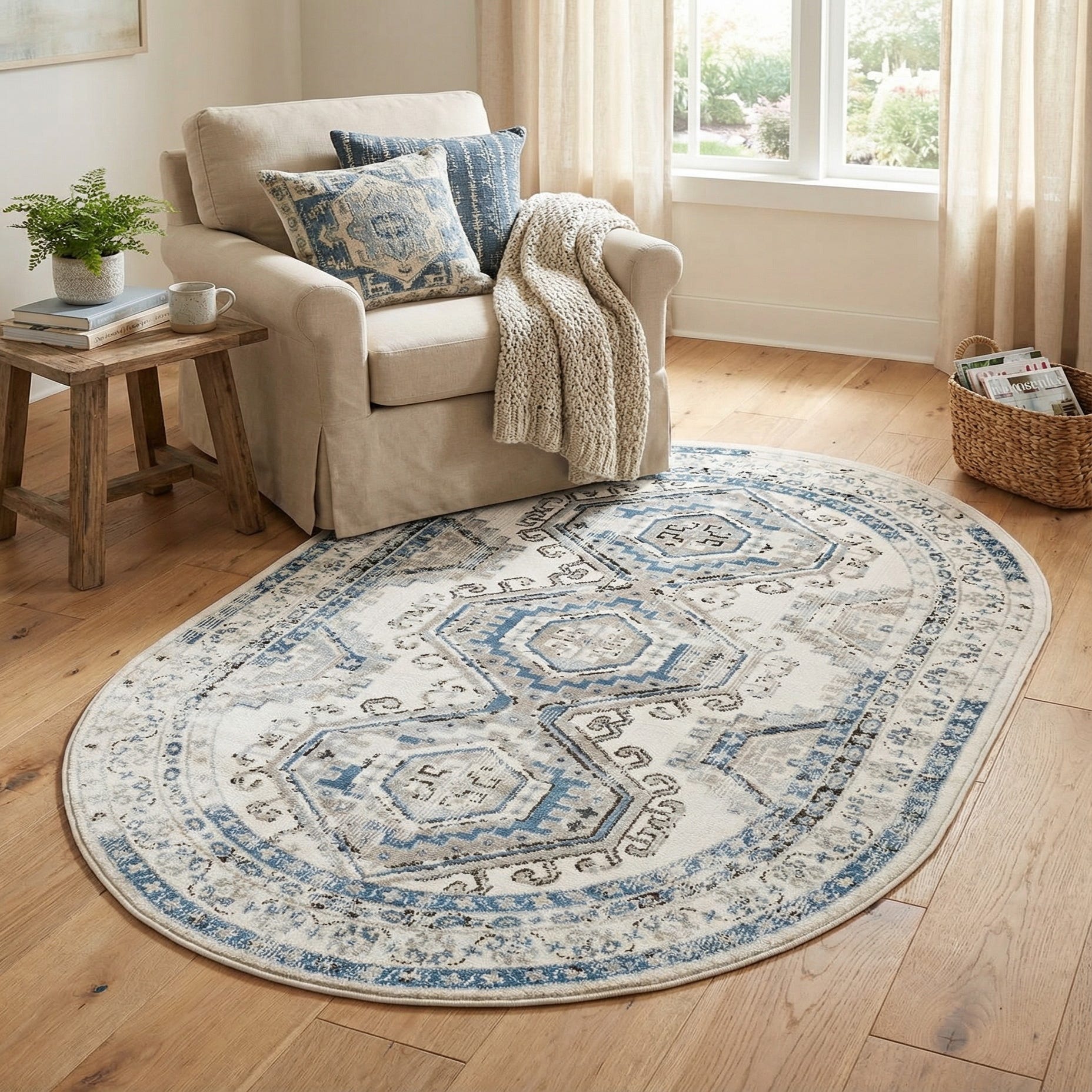 An oval 4'x6' Rugs.com Charlotte rug featuring a distressed traditional tribal pattern in blues, ivories, and creams.
