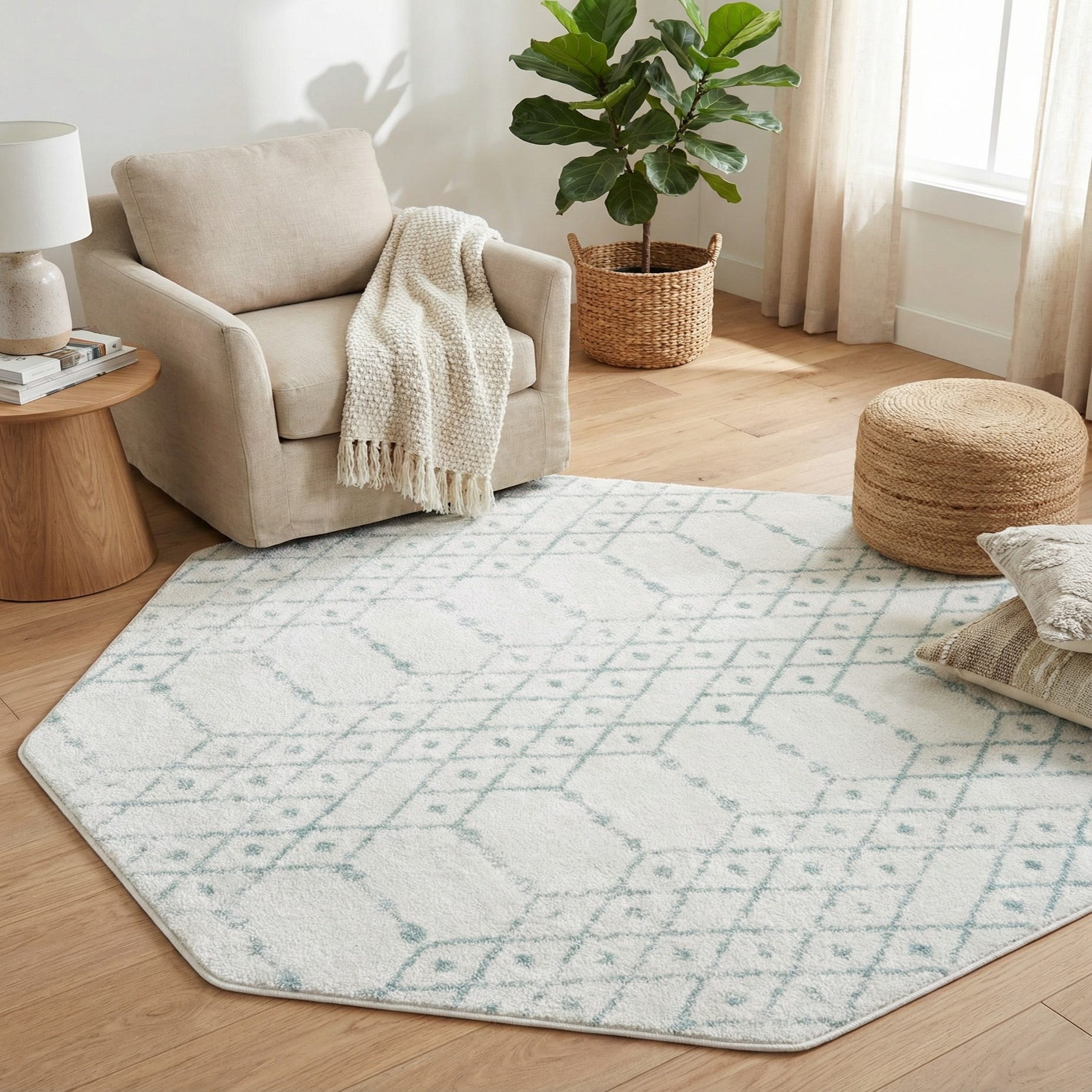 An octagonal rug with a soft ivory ground and a pale aqua trellis pattern, this piece pairs geometric structure with a gentle, airy palette. Interlocking diamond lines and elongated ovals form a repeat pattern that has a slightly worn look, giving the surface visual depth without heavy contrast. The aqua highlights are subtle against the ivory background, creating a fresh, calm feel that reads modern yet approachable.