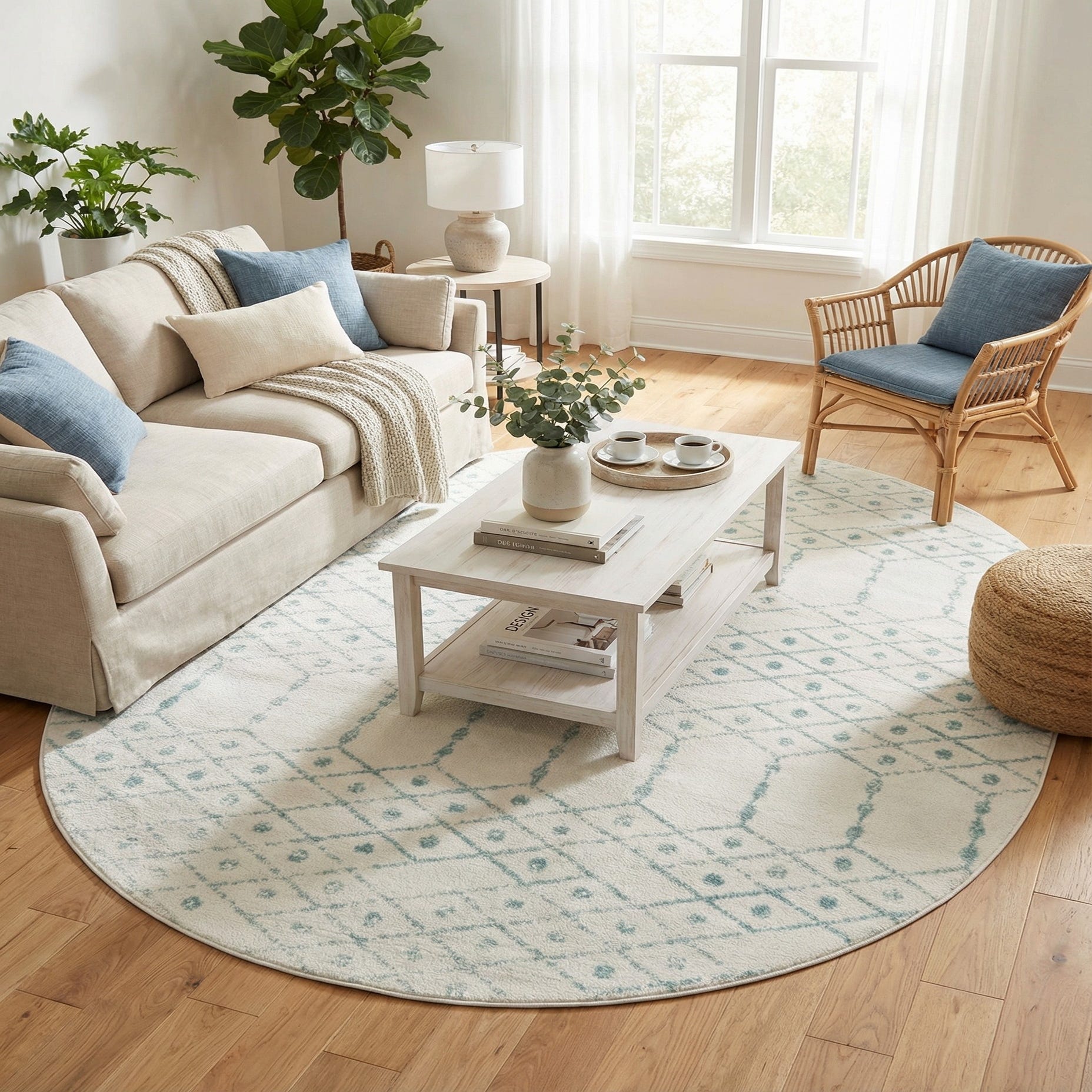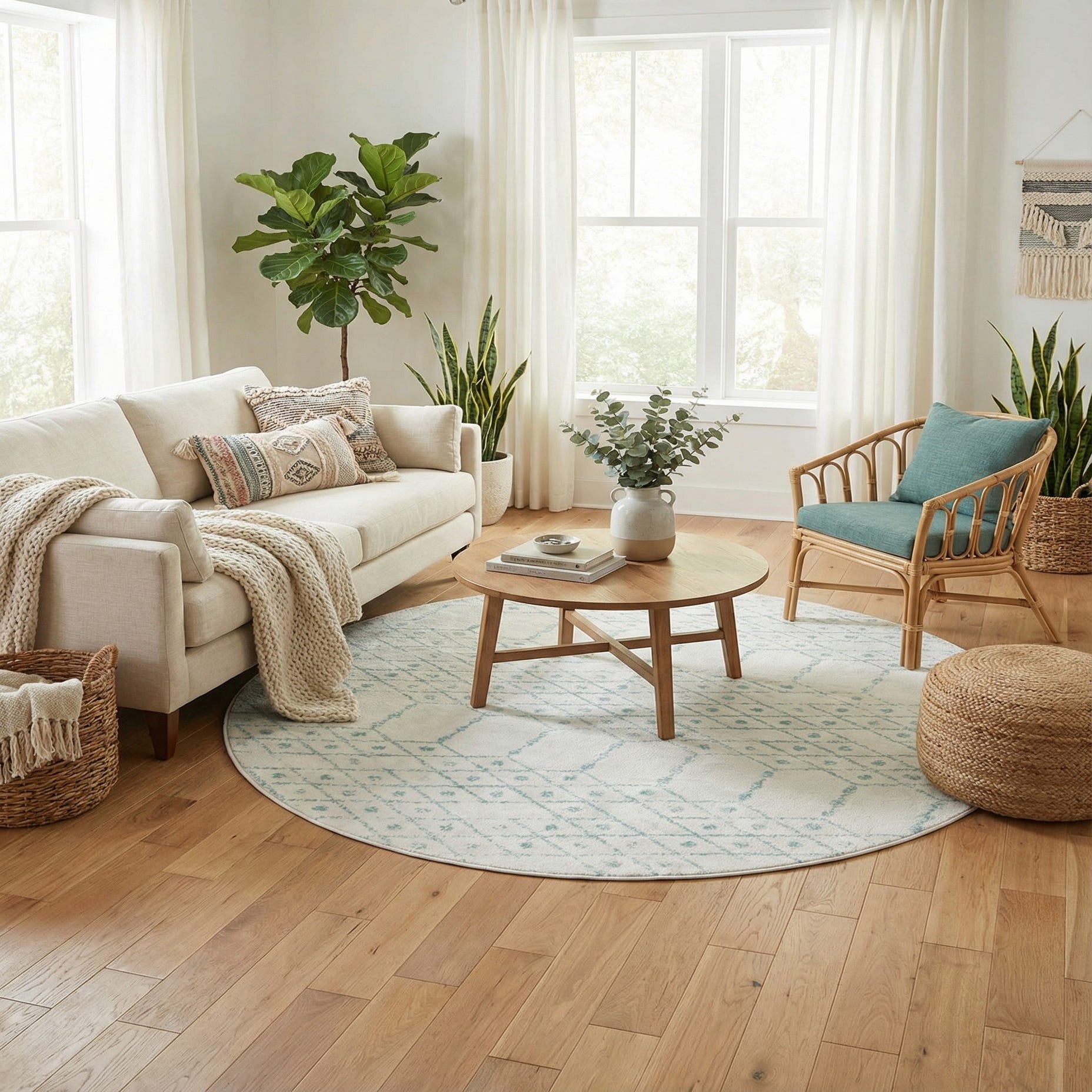 Machine made of 100% polypropylene, this rug delivers consistent construction and a firm hand that suits everyday spaces. It pairs naturally with coastal and modern farmhouse palettes—think whitewashed wood, linen upholstery, and muted blues—but also fits clean, contemporary interiors or a light, casual bedroom. Use it to anchor a seating area, soften a reading nook, or layer beneath a round table to emphasize curved furniture arrangements.