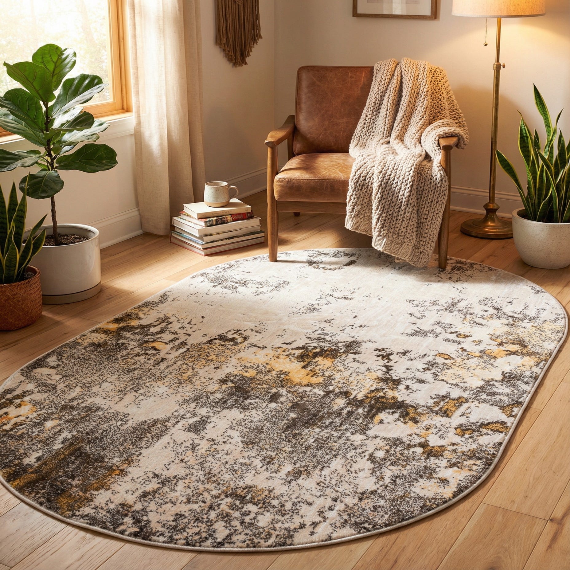 Machine-made from 100% polypropylene (space-dyed yarn), this oval rug layers easily into a variety of interiors. Place it in a foyer or entry to warm hardwood floors, tuck it under a small round dining table to emphasize a cozy seating arrangement, or set it at the foot of a bed to add an understated focal point. The neutral ivory base and touches of gold work well with warm woods, soft neutrals, and mixed-metal accents, making it a versatile choice for contemporary, transitional, or modern farmhouse rooms.
