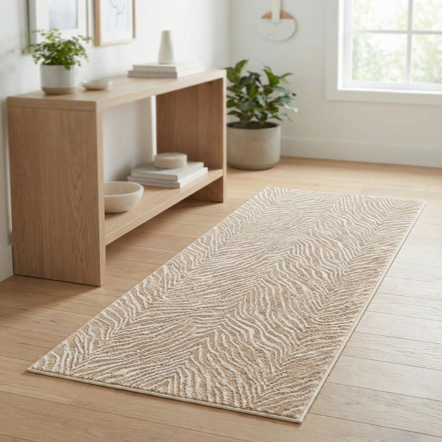 A 5 ft runner rug with a textured, high pile in varying shades of brown, tan, and cream, featuring an abstract, wavy chevron pattern.