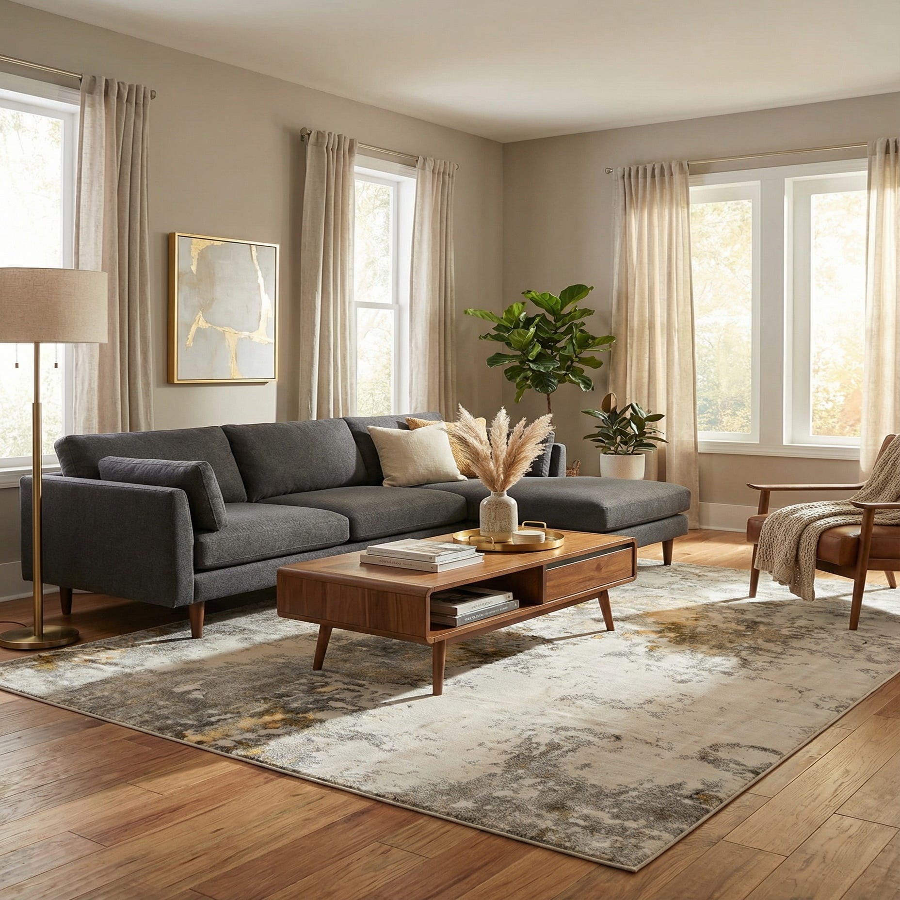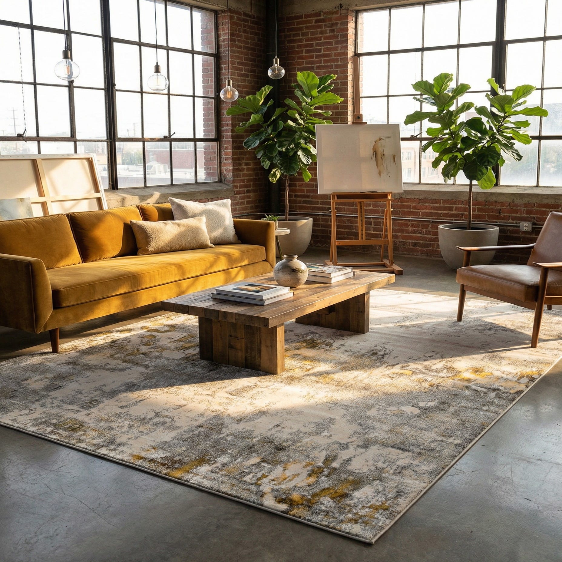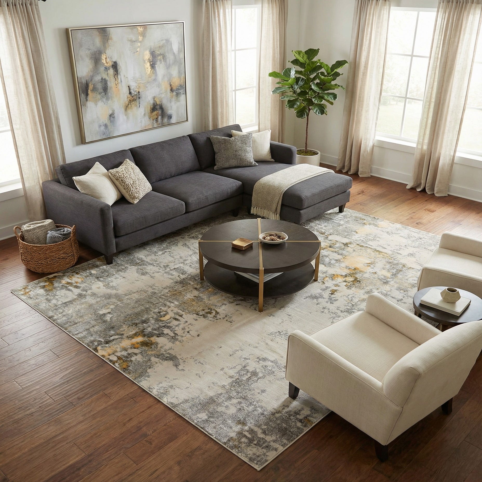 This rug works well in contemporary and transitional interiors where a neutral base with a hint of warmth is needed. Pair it with walnut or warm oak furniture and brass or gold accents to play up the gold highlights, or use it under a neutral sofa to add depth without overpowering the room. It also anchors bedroom and dining areas nicely—position it so key furniture pieces sit partially on the rug to define the space while keeping the overall palette light and layered.