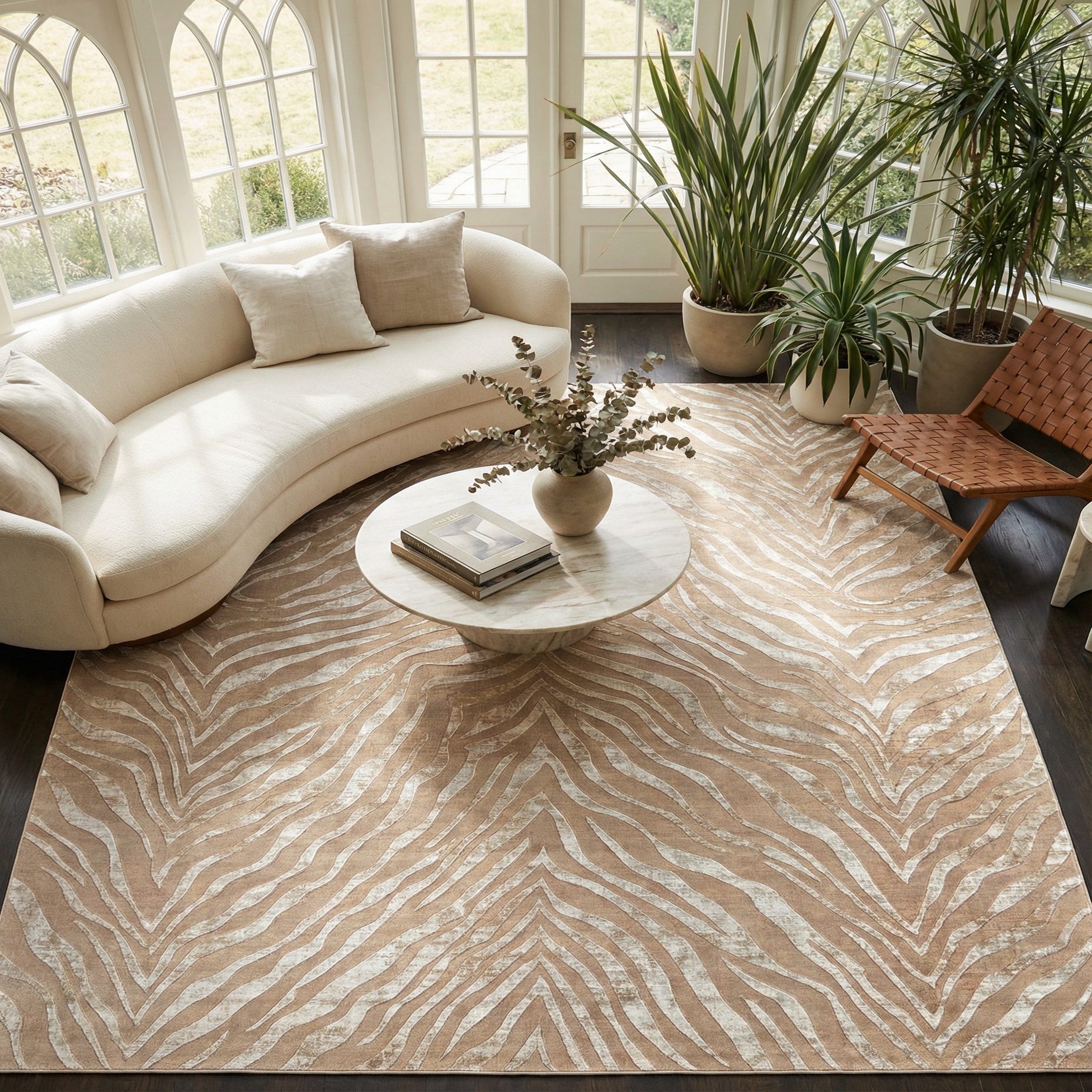 This neutral, animal-inspired motif works well in contemporary and transitional interiors—pair it with warm wood tones and linen upholstery for a relaxed living room, layer it under a glass coffee table to add pattern without heavy color, or use it to bring subtle pattern to a calming bedroom palette. It also complements modern glam or coastal schemes when combined with brass accents and light textiles, and it can ground a home office while keeping the overall look refined and approachable.