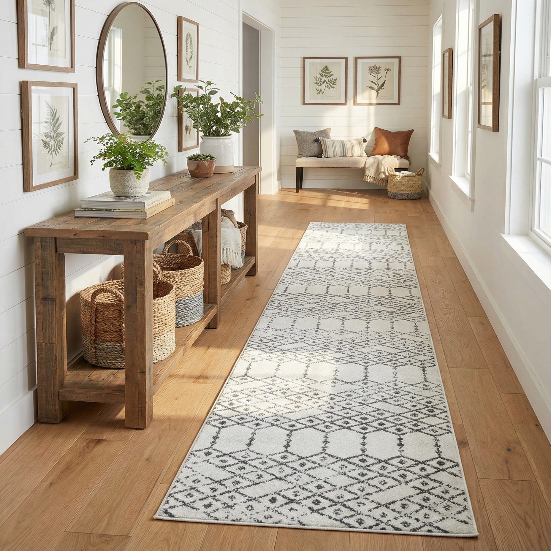 A 16 ft ivory and black tribal runner rug with a modern trellis pattern, ideal for a hallway.