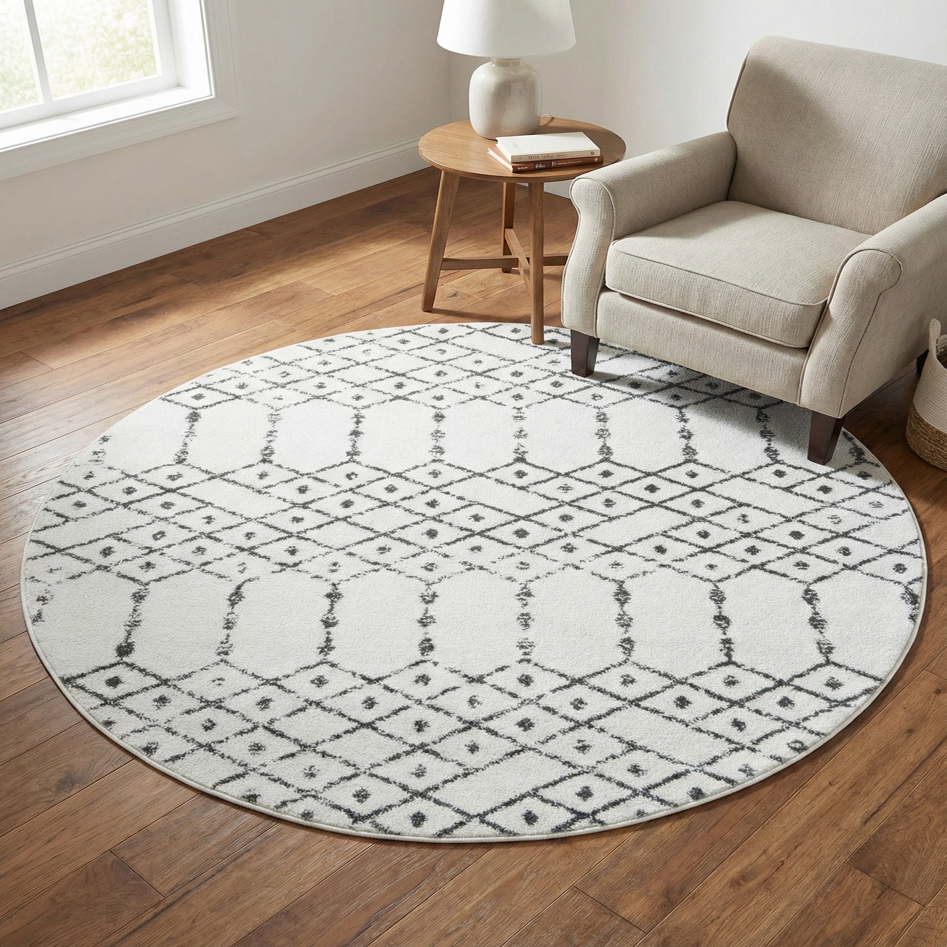 This versatile piece works well as an anchor for a small seating area, under a round dining table, or in a bedside vignette where a compact, graphic touch is needed. It complements light wood and warm metal finishes, clean-lined contemporary furnishings, or a relaxed Scandinavian palette, and also pairs nicely with layered textiles for a softer, eclectic look.