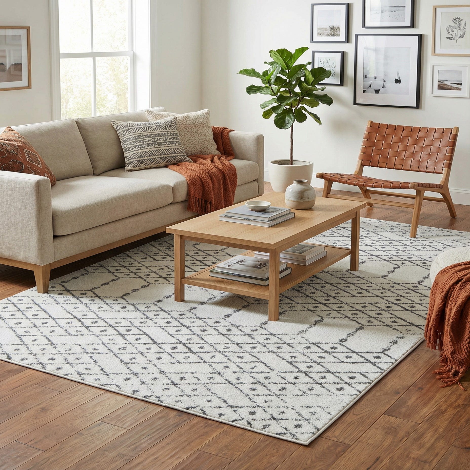 This rug pairs naturally with light-wood furnishings, black metal accents, and neutral upholstery for a clean, contemporary aesthetic. It also complements Scandinavian and modern farmhouse schemes where a simple geometric anchor is needed beneath a seating group or at the foot of a bed. The understated color palette makes it easy to layer with textured throws, woven baskets, or a patterned pillow for a balanced, comfortable room.