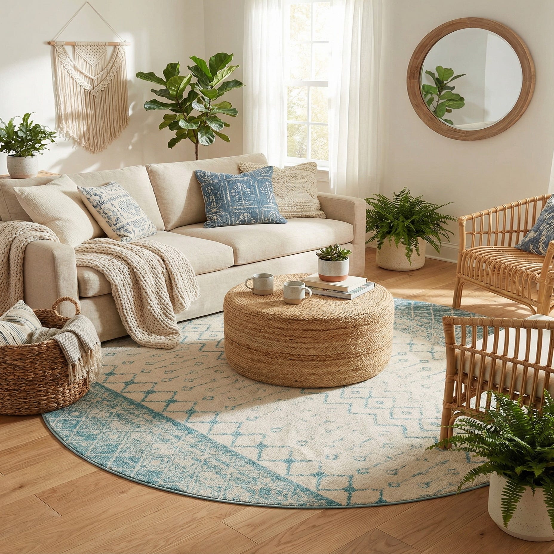 A 10-foot round bohemian rug with a cream background and faded blue tribal patterns, including zigzags and diamonds.