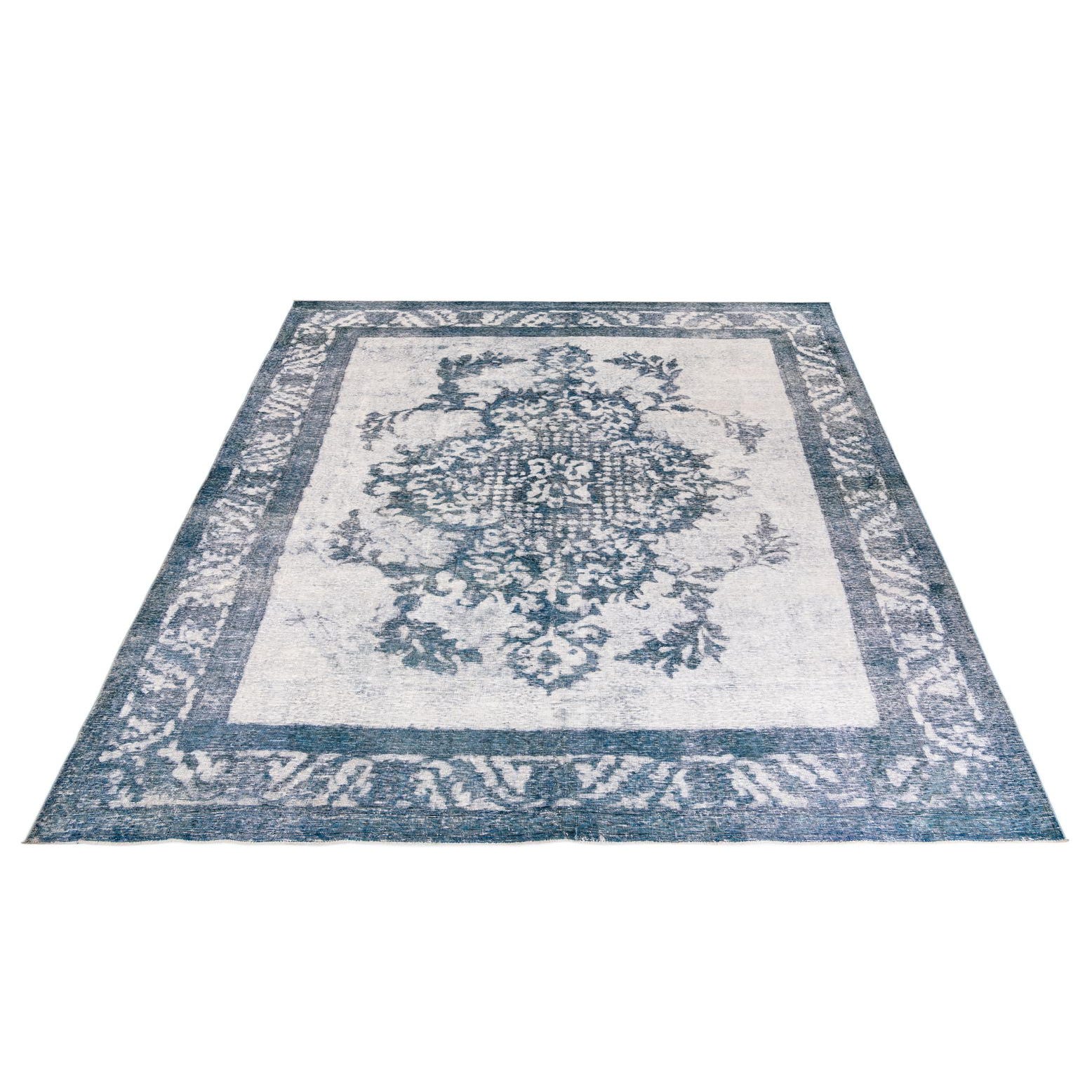 A 10x12 rectangular Ultra Vintage rug featuring a faded blue Persian medallion pattern on an ivory and cream background, with a distressed border.
