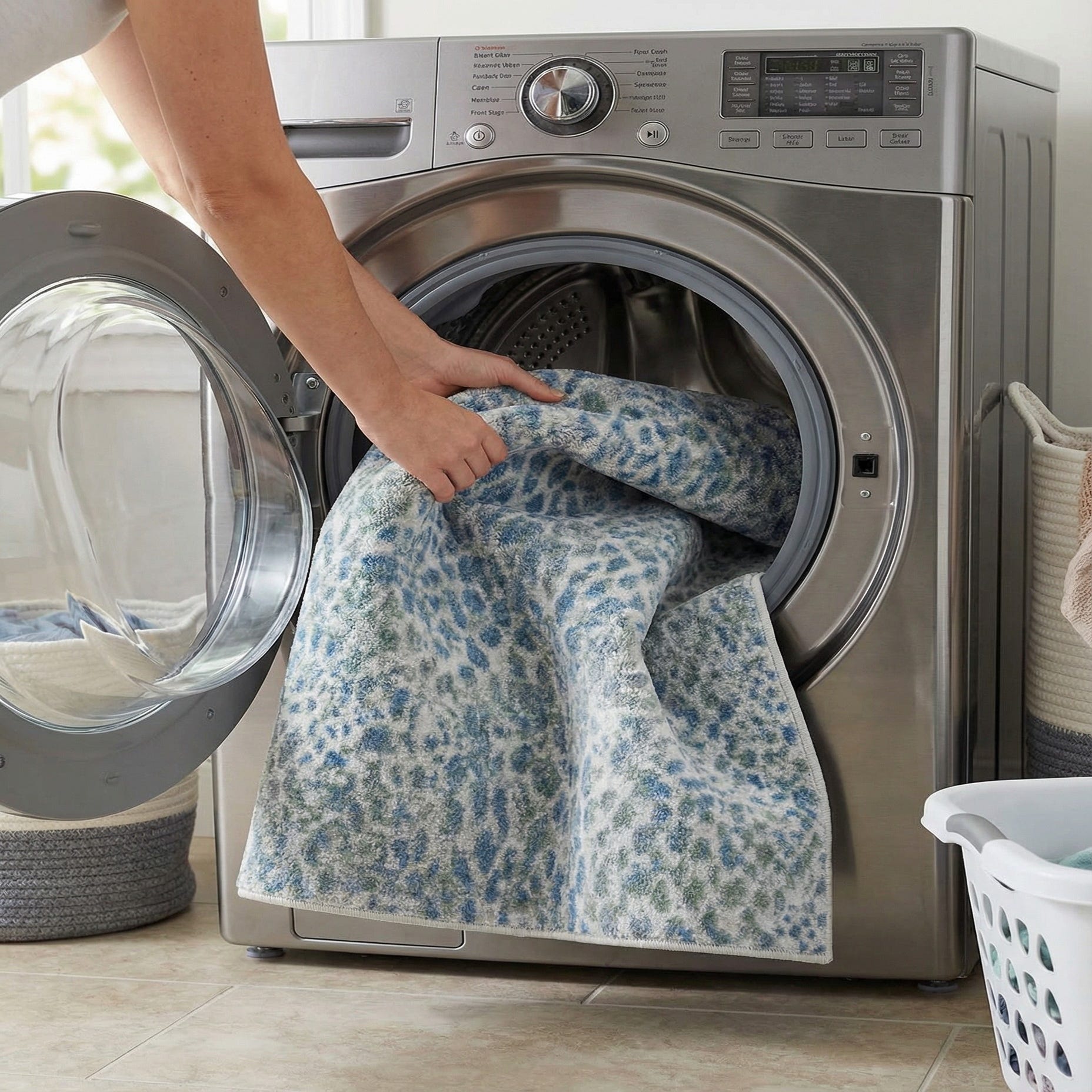 A 2x3 rectangular Kamala Washable rug featuring an abstract pattern of blue, ivory, and cream speckles on a light background.