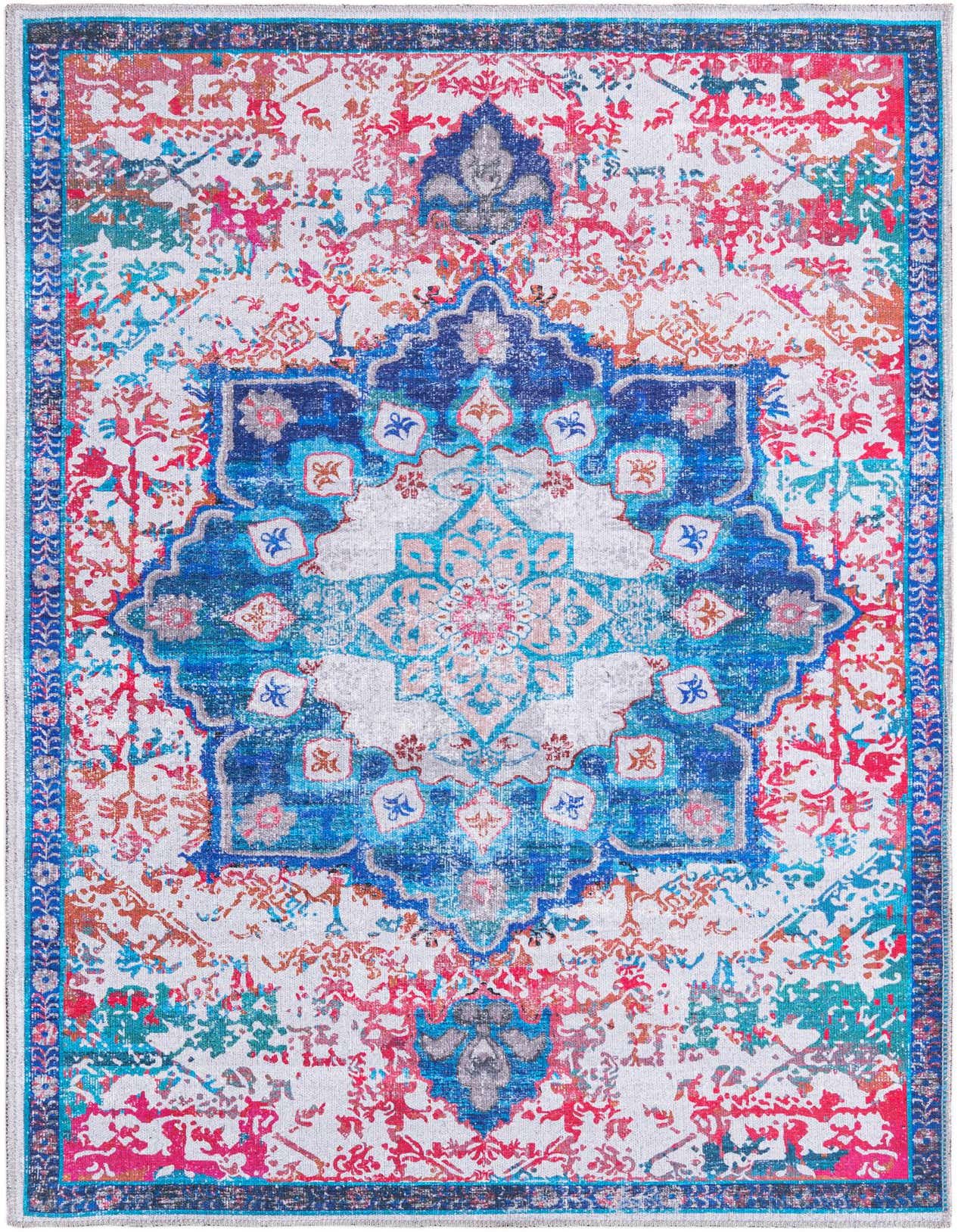 Primary color is Ivory Blue. Colors in this rug include: Ivory Blue, Black, Blue, Ivory, Gray, Red, Orange, Pink.