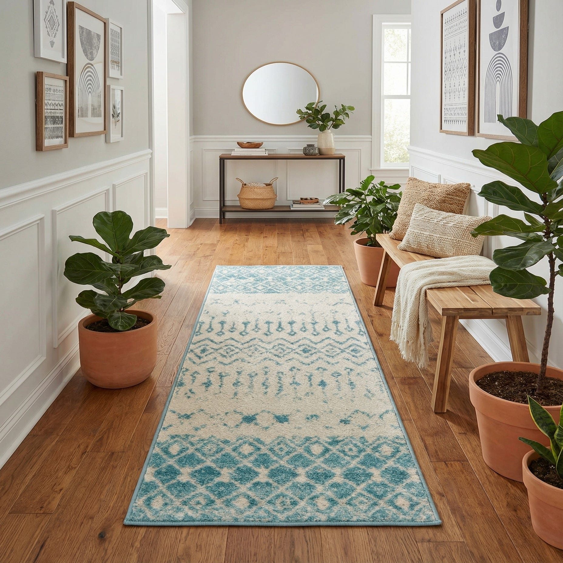 This runner works well in coastal, cottage, or casual contemporary interiors where a light, airy palette is desired. Use it to anchor a hallway or entry, soften a kitchen runner run, or layer at the foot of a bed — pair with white or weathered wood furnishings, pale linens, and woven accents for a relaxed, cohesive feel.