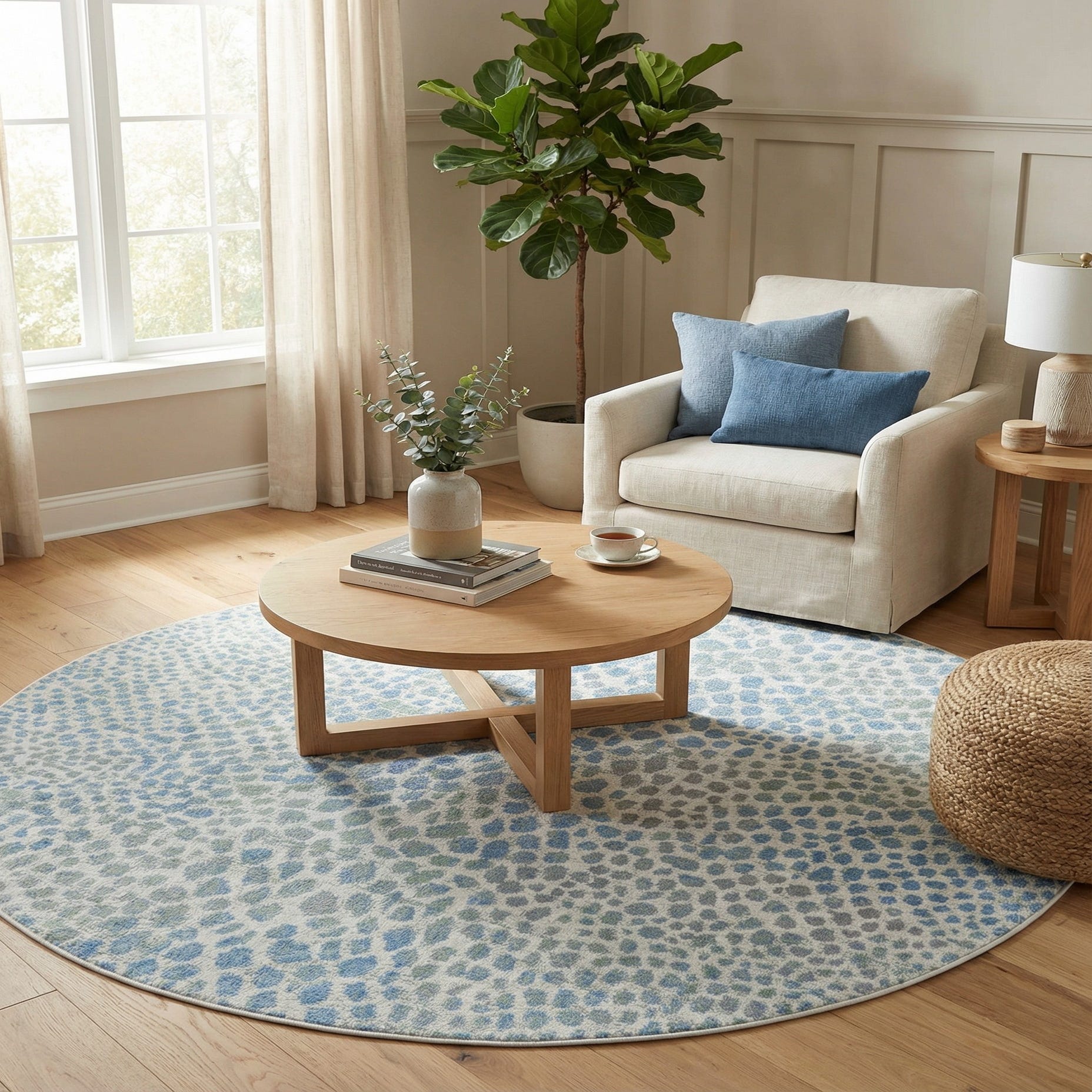 The casual, organic pattern and airy palette work well in coastal, contemporary, or Scandinavian-inspired rooms. Place it beneath a round dining table to define the space, layer it in a living room to soften hardwood floors, or add it to a bedroom or nursery for a calm, fresh foundation. Pair with light wood furniture, linen upholstery and mixed-metal accents to enhance the rug’s soft blue and gray tones.