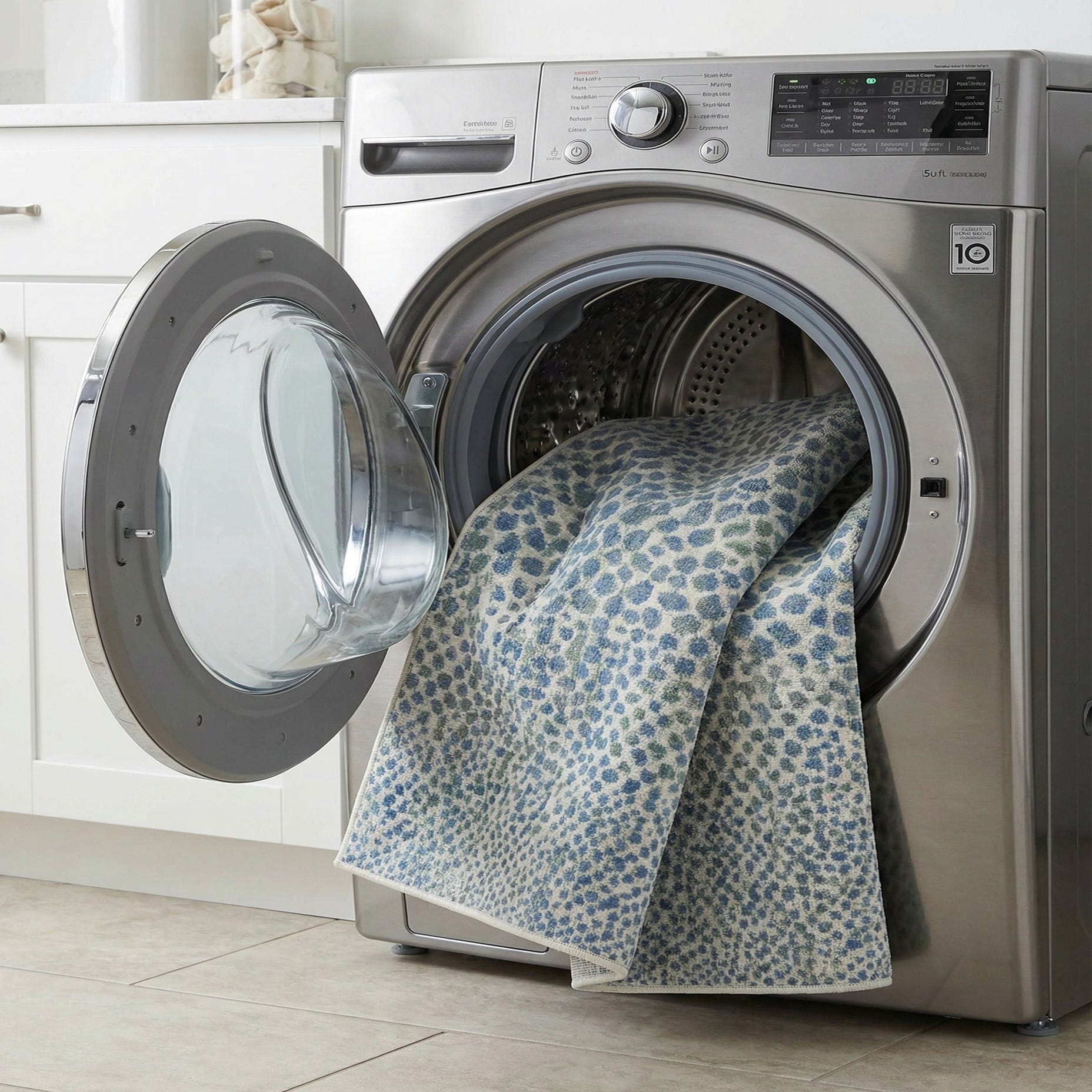 A 7' 10 x 7' 10 square Kamala Washable rug featuring an abstract pattern of blue, ivory, and cream speckles on a light background.