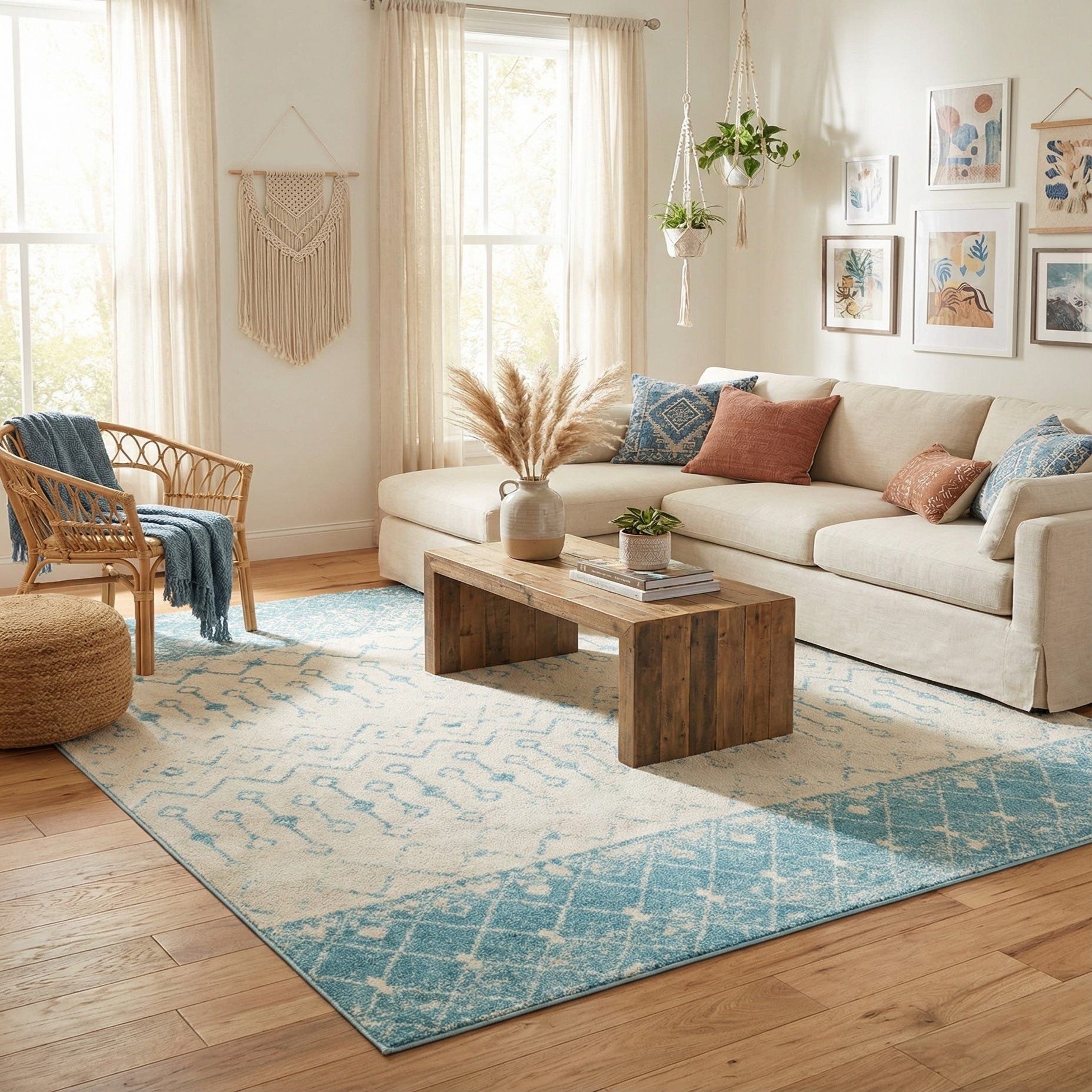 This rug fits easily into coastal, transitional, or modern farmhouse interiors, where its cool palette and relaxed pattern complement light woods, white-painted furniture, and linen upholstery. It works well layered over hardwood in a casual living room, centered beneath a round dining table, or placed in a bedroom to add softness and quiet pattern without overwhelming the space.