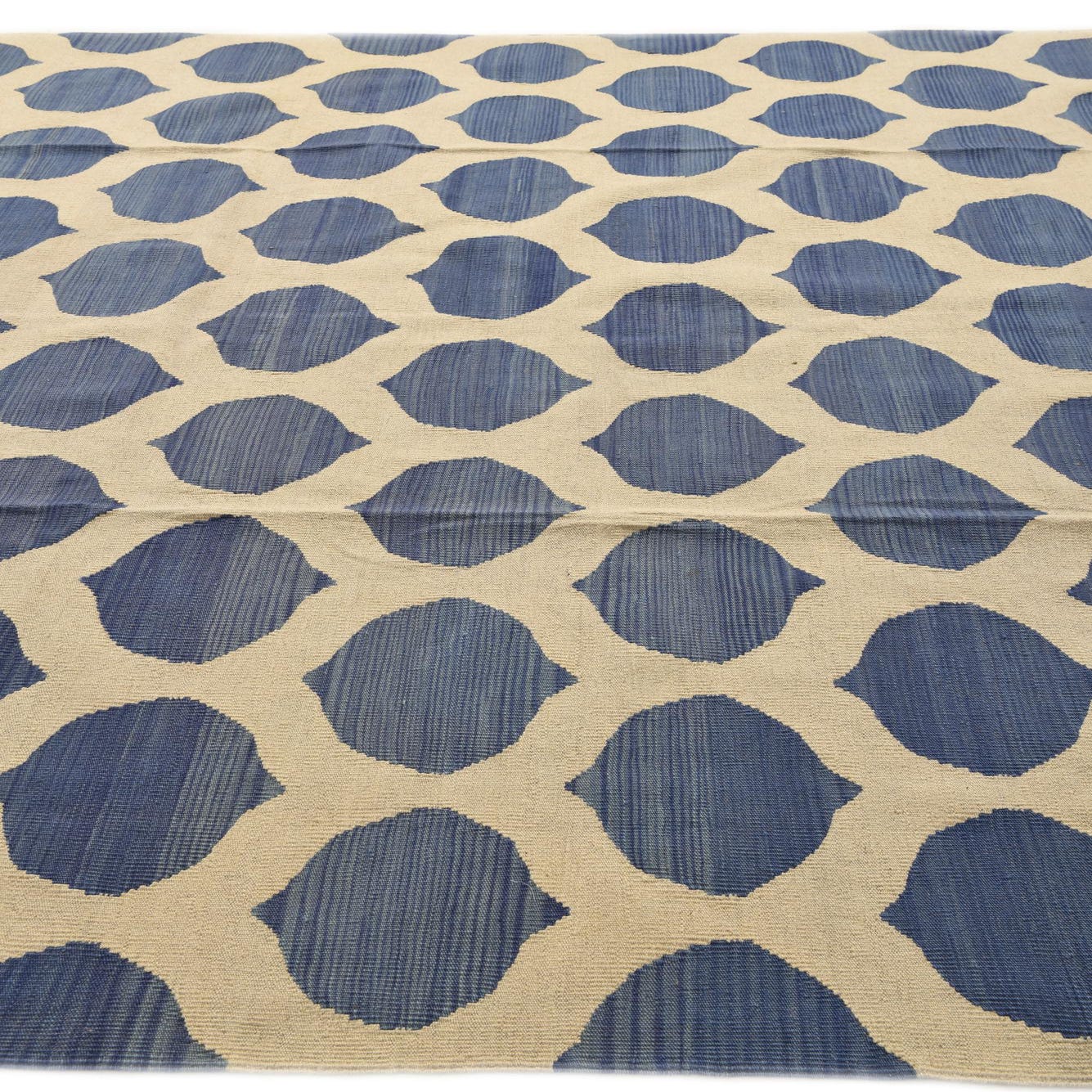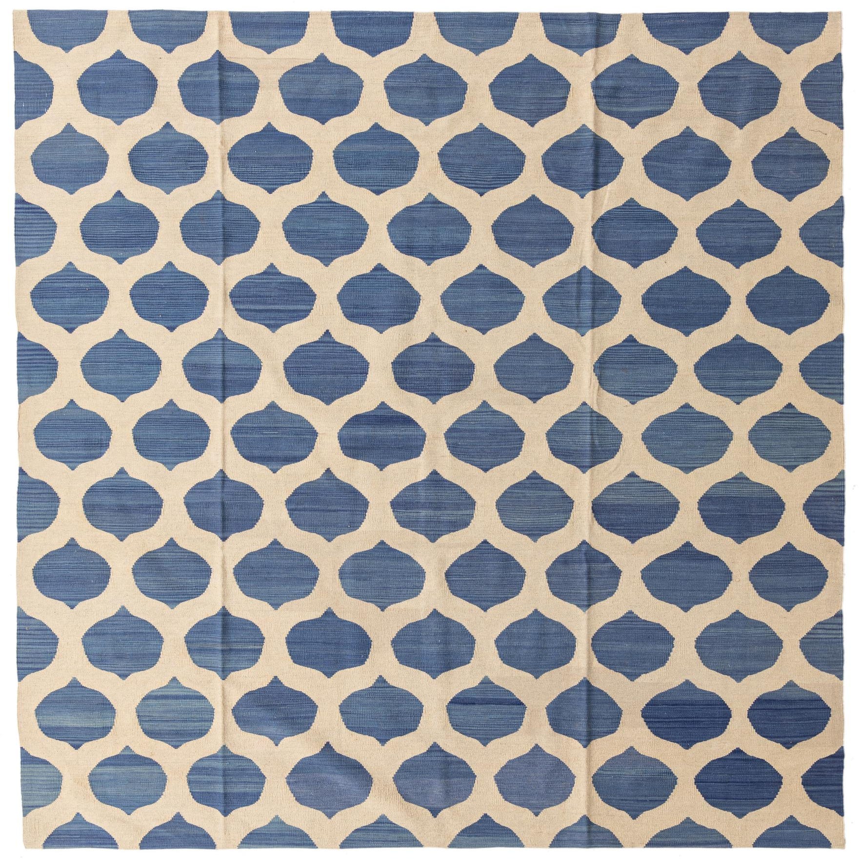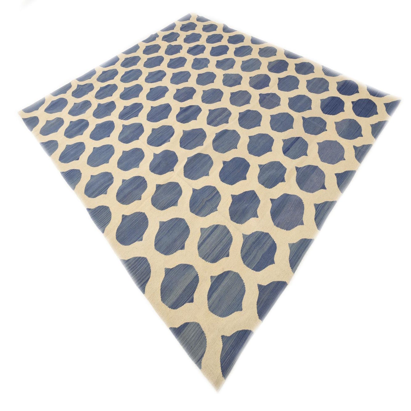 The Kilim Modern collection presents a hand-woven 8x10 rug crafted from 100% wool, featuring a distinctive pattern that is both timeless and contemporary. The rug's visual appeal is characterized by a repeated geometric pattern, offering a series of interconnected shapes that create a harmonious lattice design. Its background color is Ivory Blue, which provides a soothing and versatile base that pairs well with various interior settings.