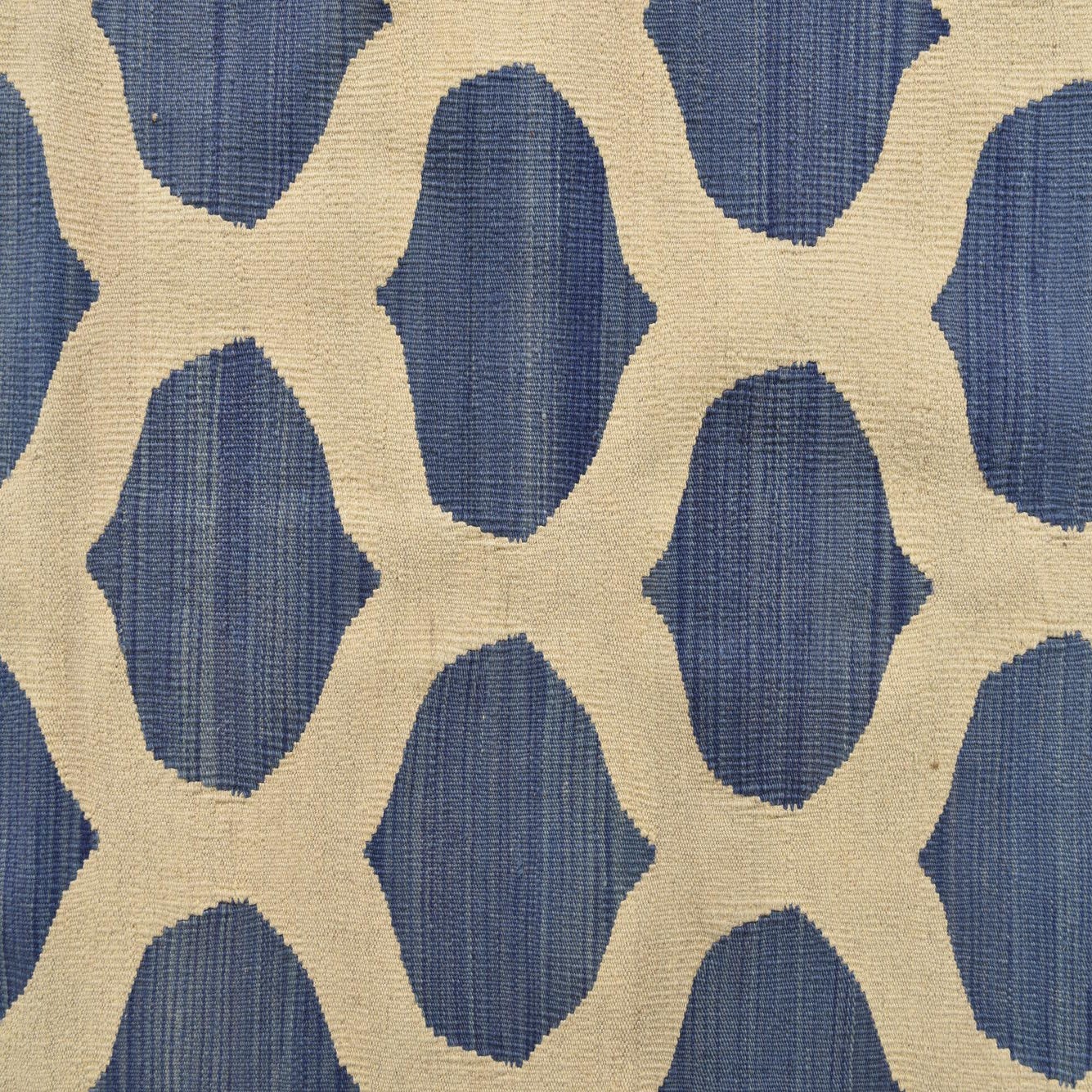 A rectangular 8x10 Kilim Modern wool rug featuring a bold blue and ivory tribal geometric pattern, suitable for a living room.