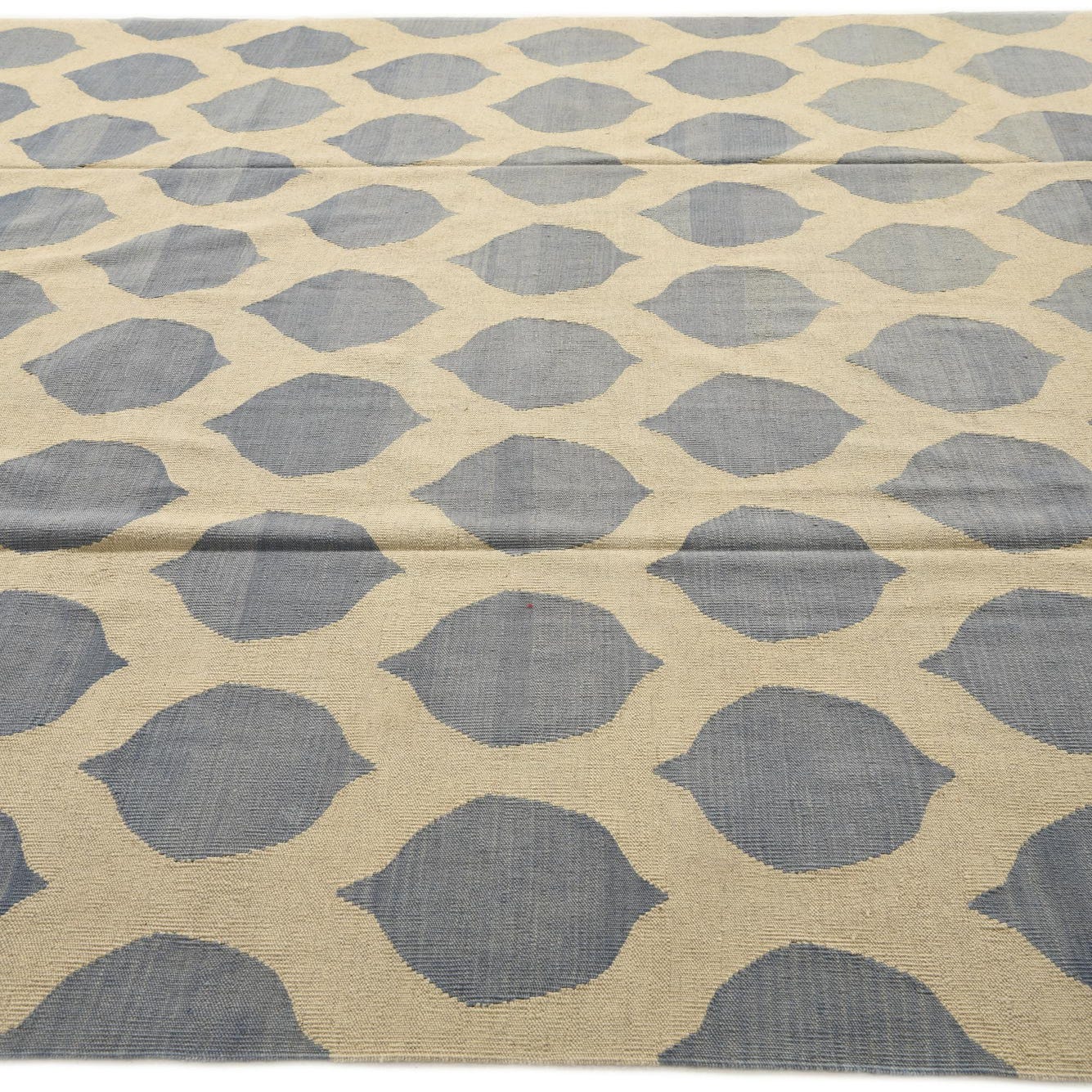 An 8x10 rectangular flatweave wool rug featuring a repeating tribal geometric pattern in shades of blue and ivory.