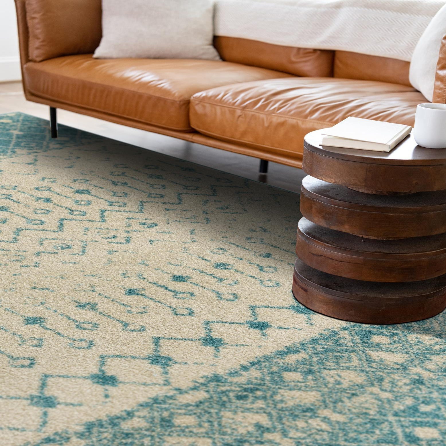 This rug works well in transitional and coastal interiors where a light, airy palette is desired. Pair it with light wood furniture and linen upholstery for a relaxed living room, tuck it under a bed to soften a serene bedroom scheme, or use it to anchor a casual dining area with painted cabinets or white-washed floors. It also layers nicely over hardwood or neutral tile when you want to introduce subtle pattern without overwhelming the space.