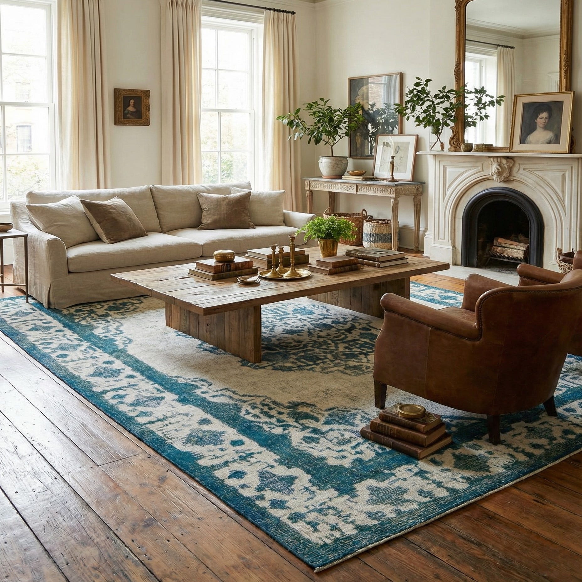 An 8x11 rectangular blue and ivory Persian-style wool rug with a distressed medallion pattern, ideal for a living room.