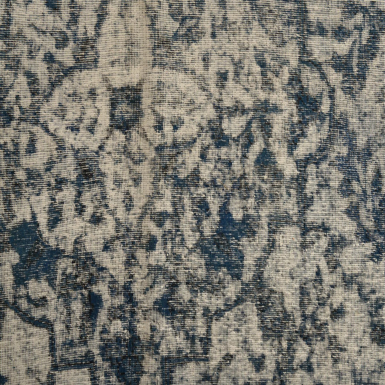 A faded medallion and scrolling foliate pattern rests on an ivory-blue field, with charcoal-black tracings that define the motif and border. The design carries a gently worn, vintage look—softly distressed areas and subtle color variation give the surface depth without heavy contrast. Hand-knotted from 100% wool, the rug has a low, dense pile with a slightly brushed finish that feels warm and tactile underfoot and highlights the pattern’s shaded nuances.