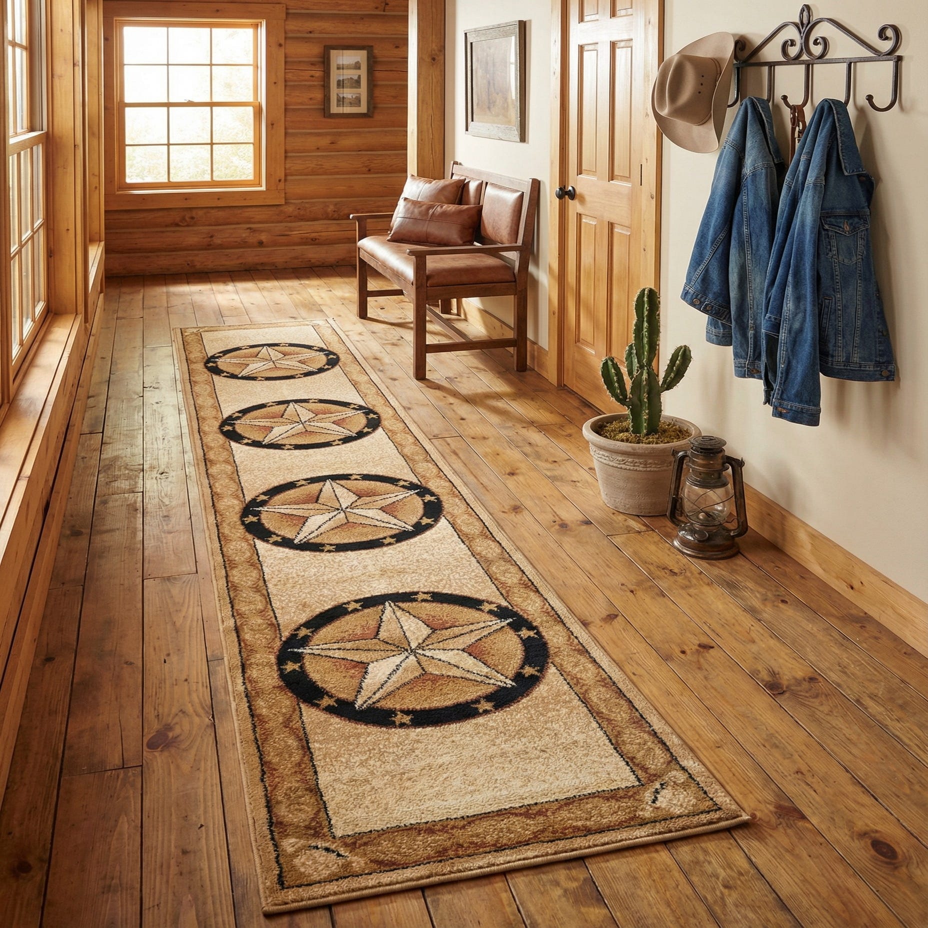 This runner complements western-inspired, farmhouse, or traditional interiors and works well in entryways, hallways, kitchens, or alongside beds where a long, narrow rug is needed. Pair it with warm wood floors, leather or distressed furnishings, and metal accents in iron or brass for a cohesive look, or layer it over a larger neutral rug to add pattern and visual direction to a corridor or foyer.