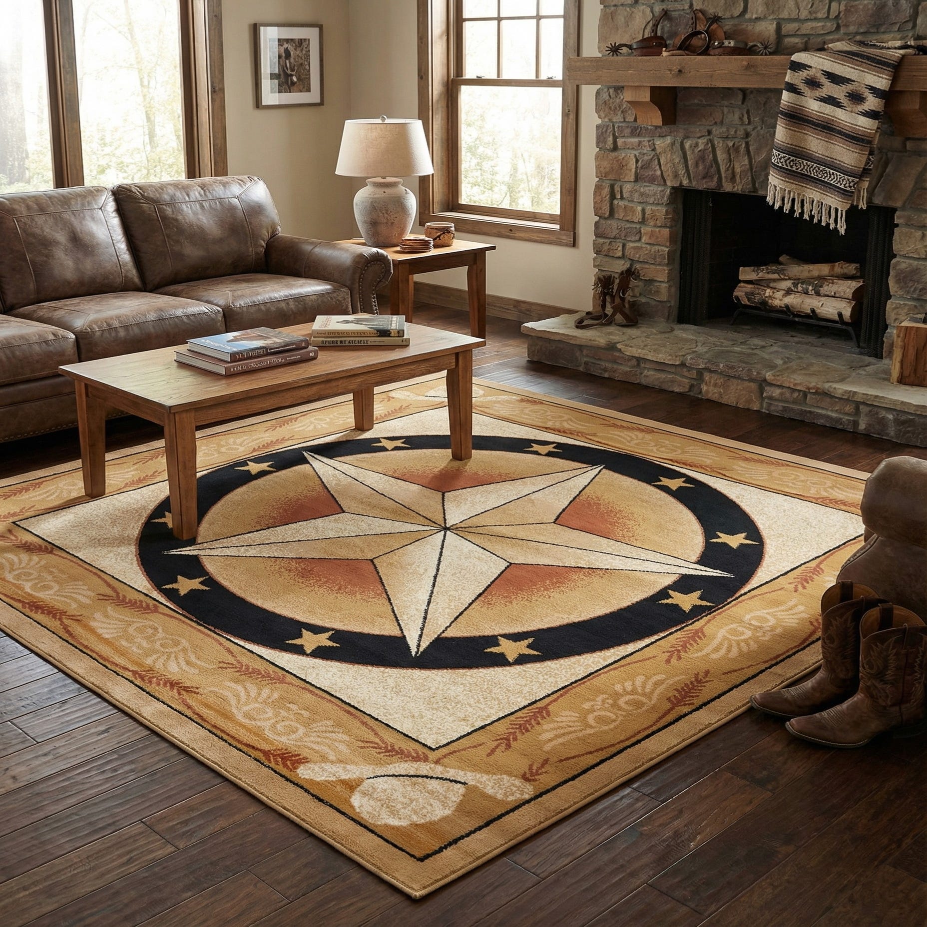 A square rustic rug featuring a large central ivory and brown star, encircled by black with gold stars, and a tan border with cowboy hats and scrollwork.