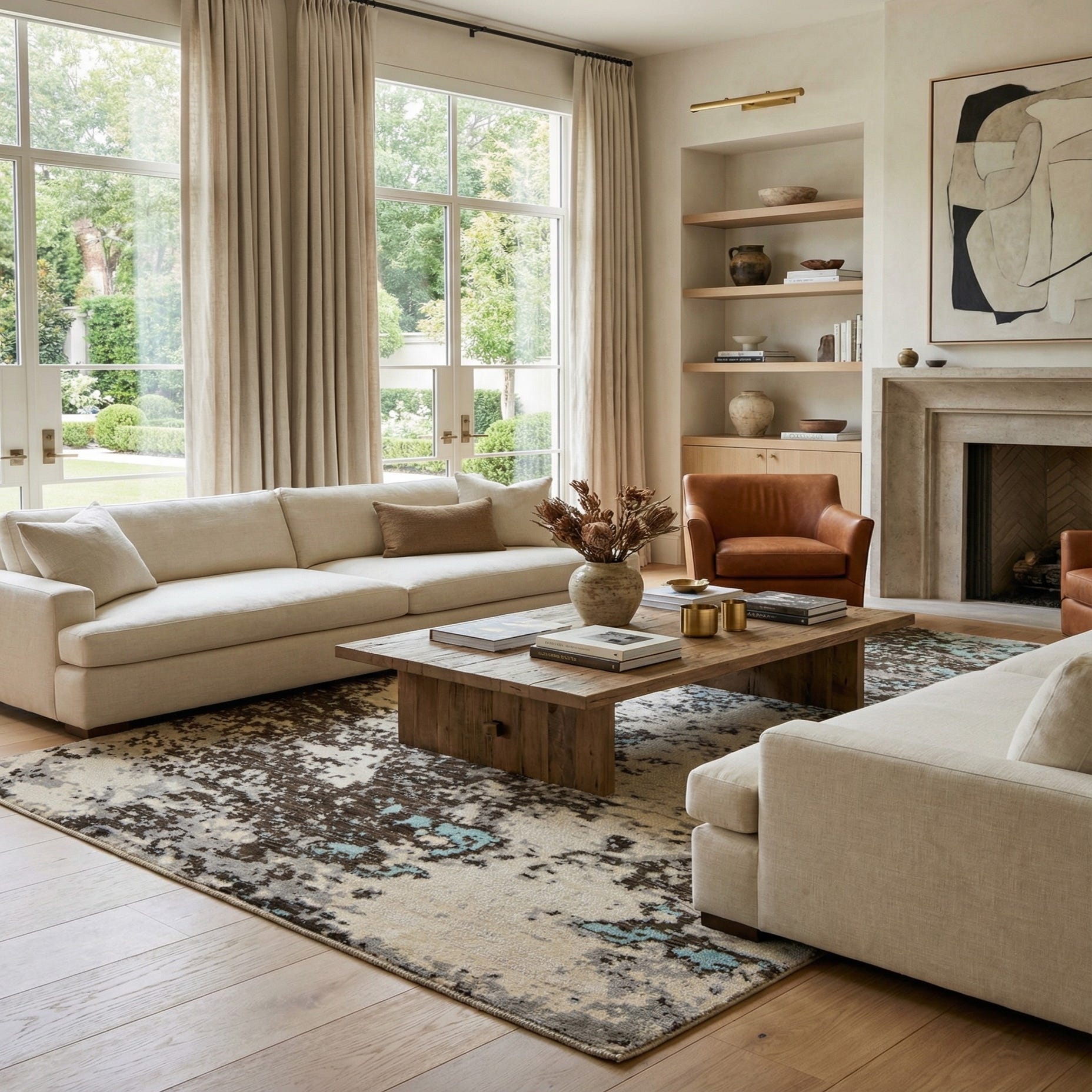 An 8x10 rectangular Darya rug with an abstract modern pattern in browns, tans, ivories, and light blue.