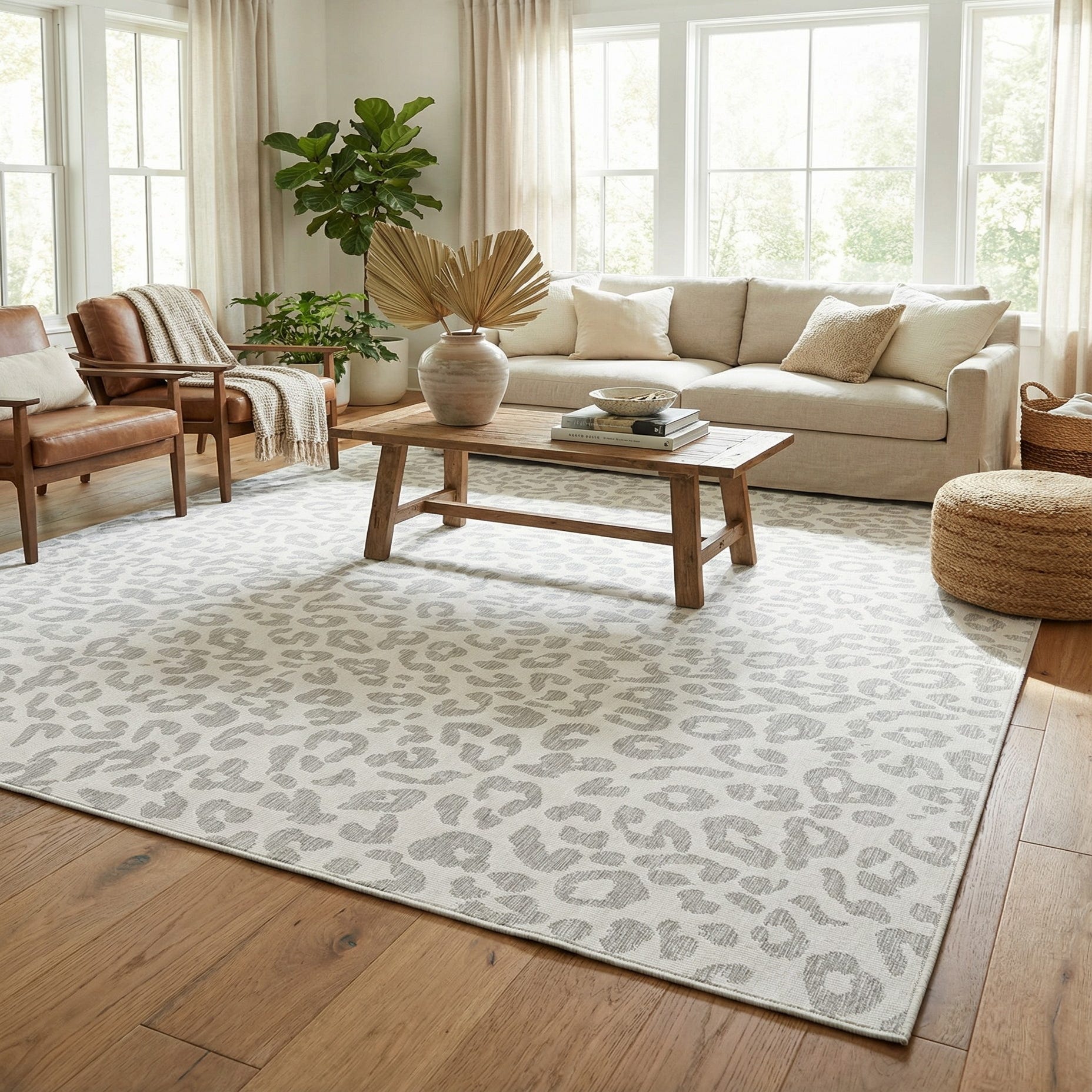 This versatile piece works well in covered outdoor living areas, sunrooms, or high-traffic interiors like family rooms and casual dining spaces. It pairs naturally with light woods, rattan and wicker, linen upholstery, or charcoal metal accents for a relaxed contemporary or transitional look. Use it to anchor a seating area, soften a dining space, or add a neutral patterned layer over hardwood or tile.