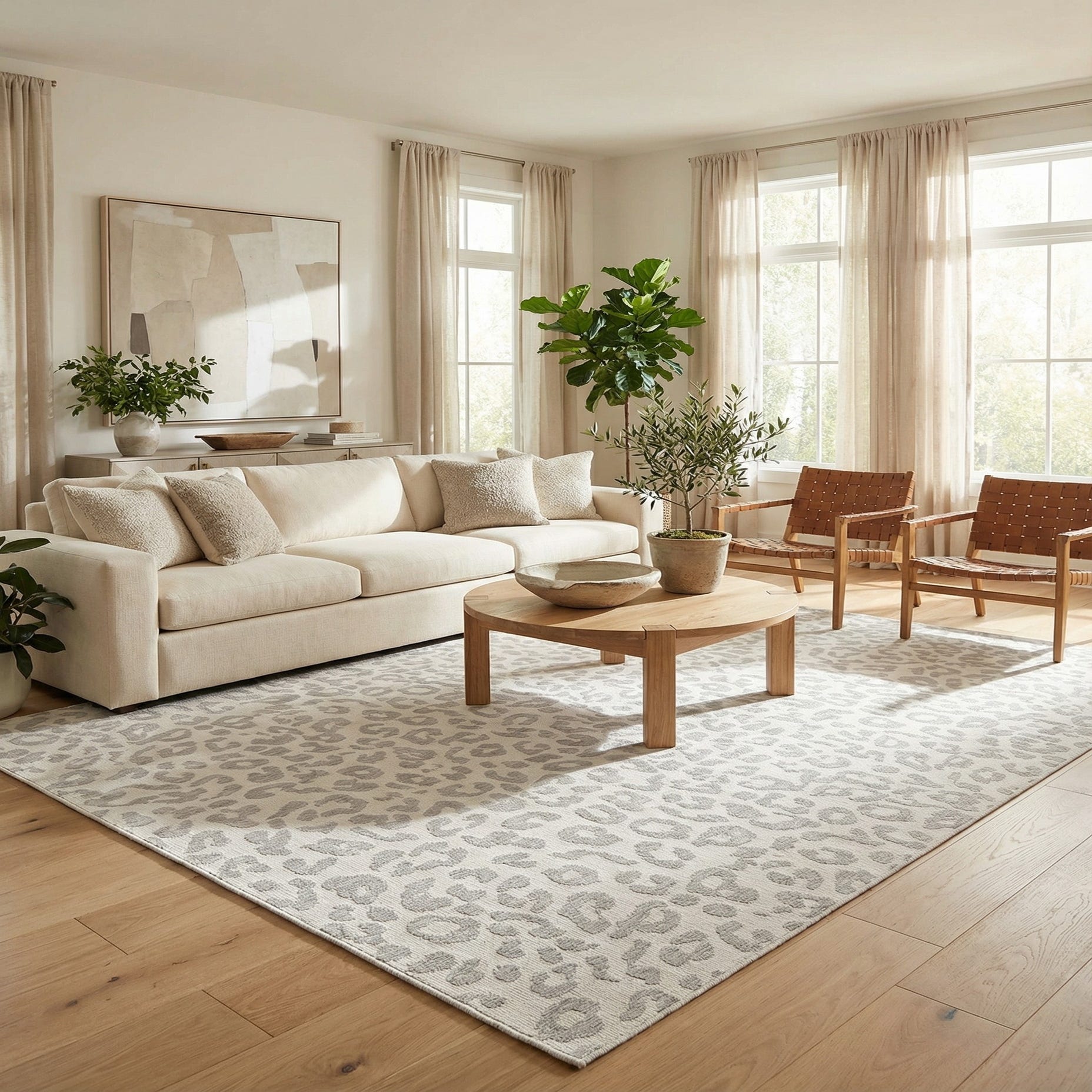 A soft, scattered leopard motif plays across an ivory gray ground, bringing a subtle animal-inspired pattern that stays calm and refined. The neutral spots are rendered in a warm dove-gray tone that contrasts gently with the background, giving the design depth without high contrast. Machine-made from 100% polypropylene, the rug has a low, tightly woven profile with a slight textured surface that you can feel underfoot—smooth enough to layer yet textured enough to add visual interest.