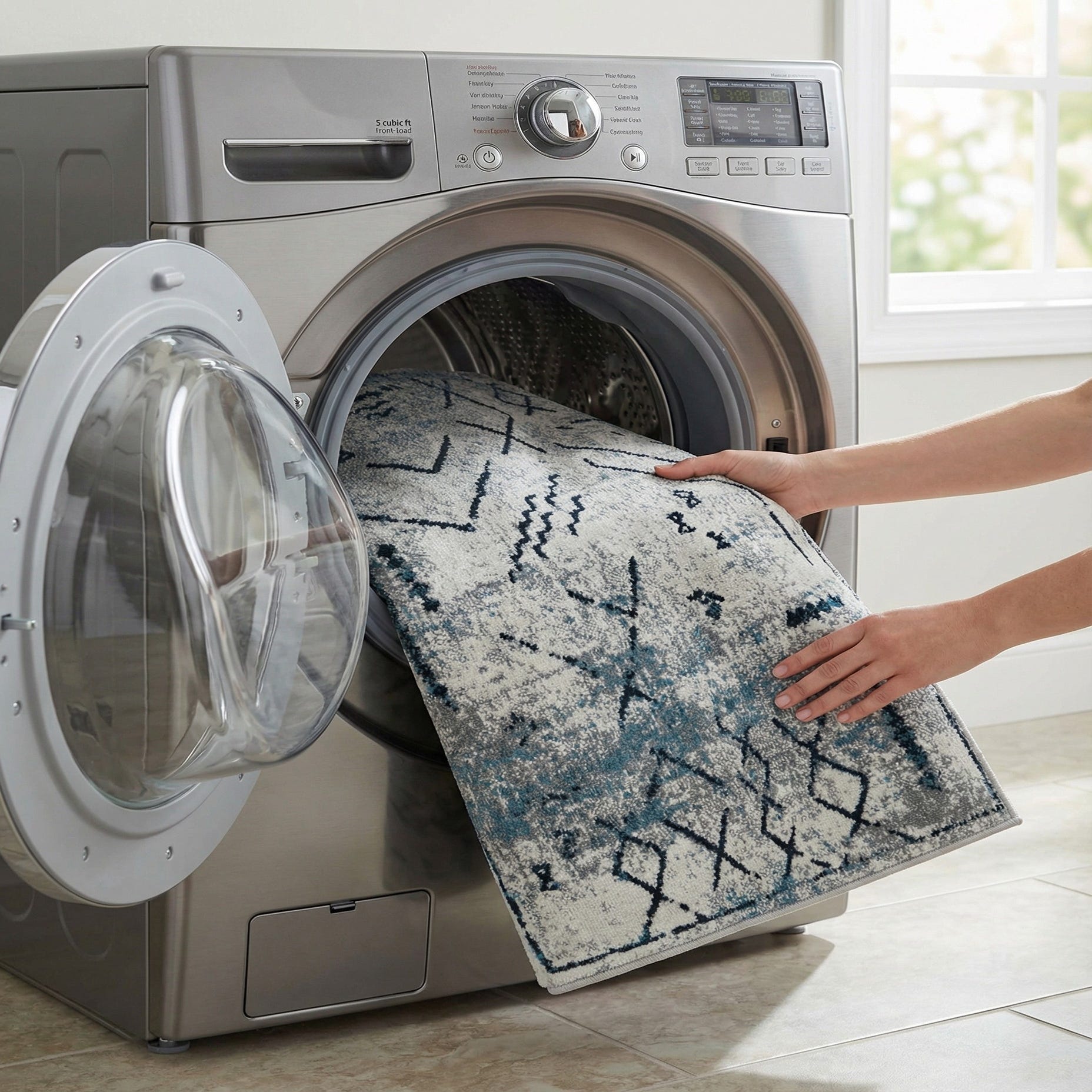 Machine-made from 100% polyester, this rug brings cool-toned color and subtle pattern into compact spaces where you want style without overwhelming the room. It works well in contemporary living rooms layered beneath a small coffee table, tucked into an entry or mudroom to soften hard flooring, or placed beside a bed to add a calm, coastal-leaning touch. Pair it with neutral linen upholstery, navy accent pillows, or light-wood furniture to emphasize the blues and keep the overall look airy and collected.