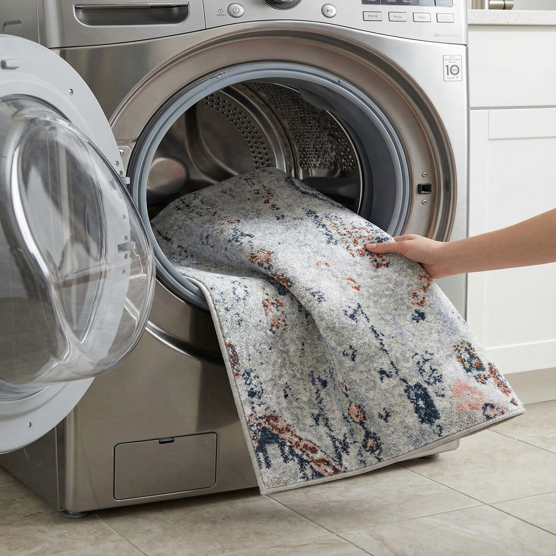 A 2x3 rectangular Kamala Washable rug featuring an abstract Southwestern pattern in ivory, cream, gray, and subtle rust tones.