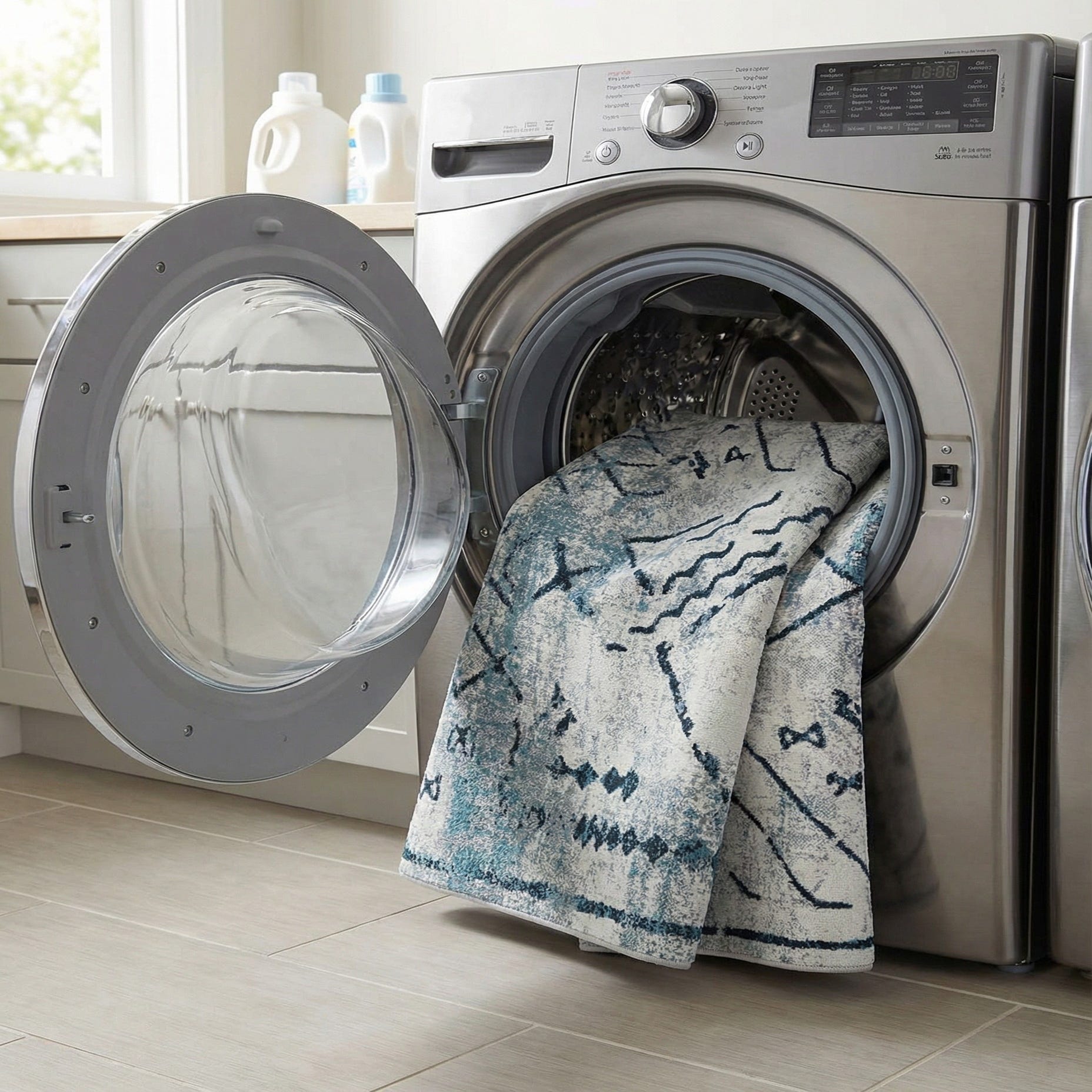 Place this rug to anchor a casual living area beneath a coffee table, or layer it at the foot of a bed to introduce soft pattern into a neutral bedroom. It also complements coastal and contemporary interiors—pair it with white or pale wood furniture and navy accents for a fresh, coastal feel—or use it in a home office to bring quiet pattern into a clean, modern scheme. The cool blue tones work well with light leathers, gray upholstery and painted cabinetry to tie a room together.