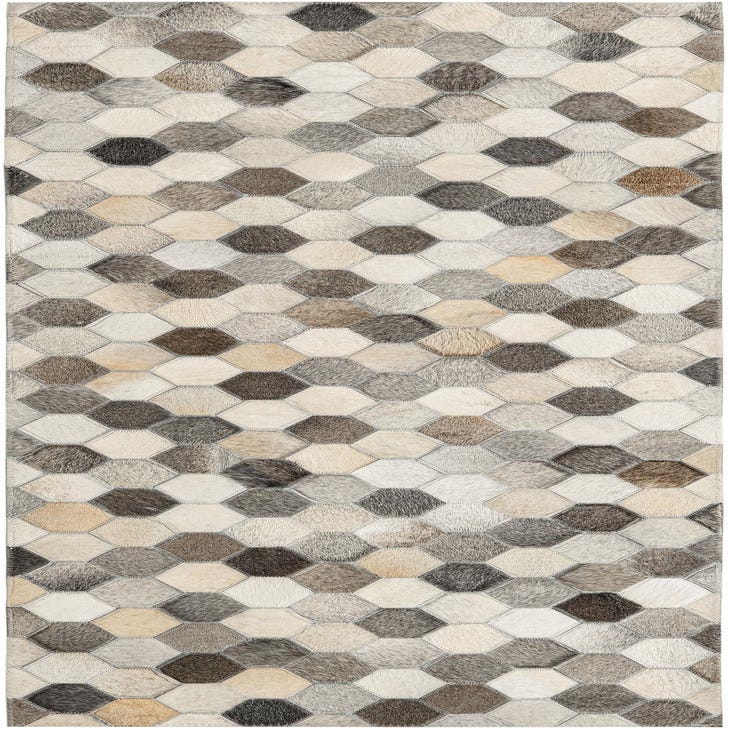 A stitched hexagon patchwork in hair-on-hide, this handmade cowhide and leather runner pairs geometric structure with natural variation. The background is Ivory Gray, with hexagons in coordinating grays, Light Brown accents and occasional Black pieces that create a calm, organic rhythm across the surface. The short-haired cowhide has a tactile, slightly dense nap and a soft sheen; each stitched hexagon shows subtle differences in hair direction and tone that read as texture underfoot while maintaining a low-profile look.