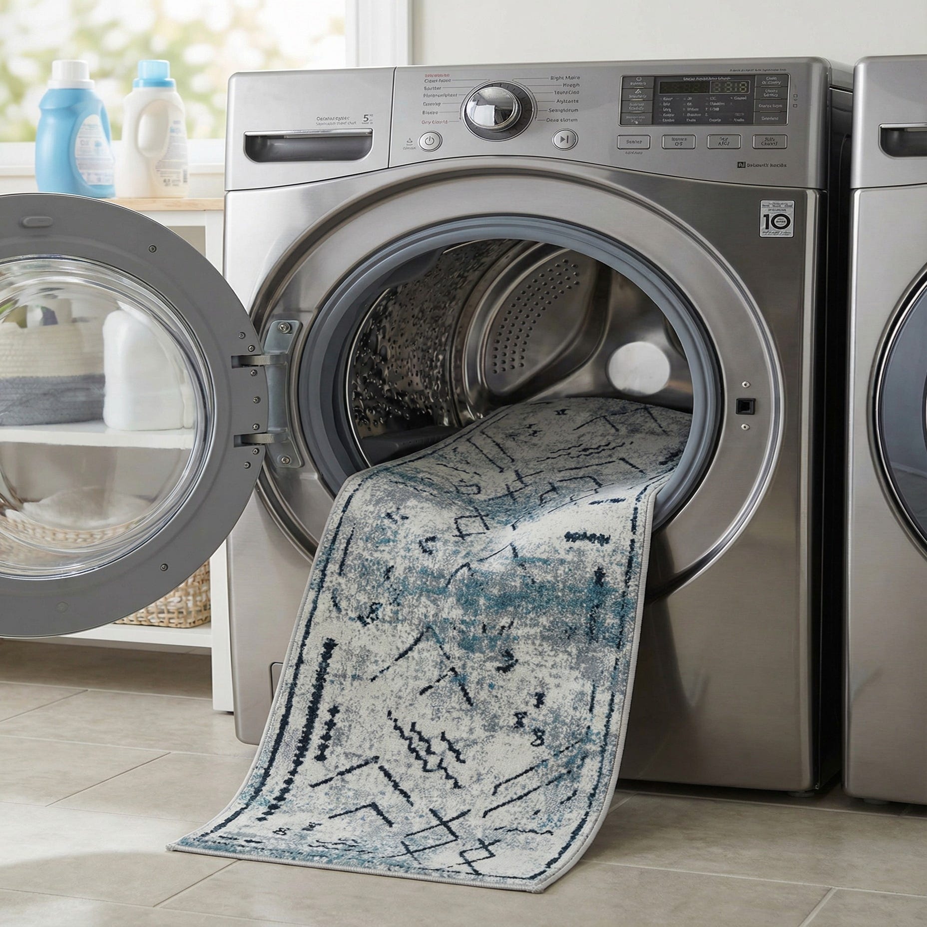 Machine-made from 100% polyester, the runner has a low-pile, softly cushioned hand with a subtle, textile-like texture that feels comfortable beneath your feet. It works well in a hallway or entry, along a narrow kitchen, or beside a bed, and pairs naturally with pale wood floors, navy or gray upholstery, and matte black or brushed metal accents. Use it to add cool-toned color and gentle pattern to modern coastal, transitional, or casual contemporary interiors.
