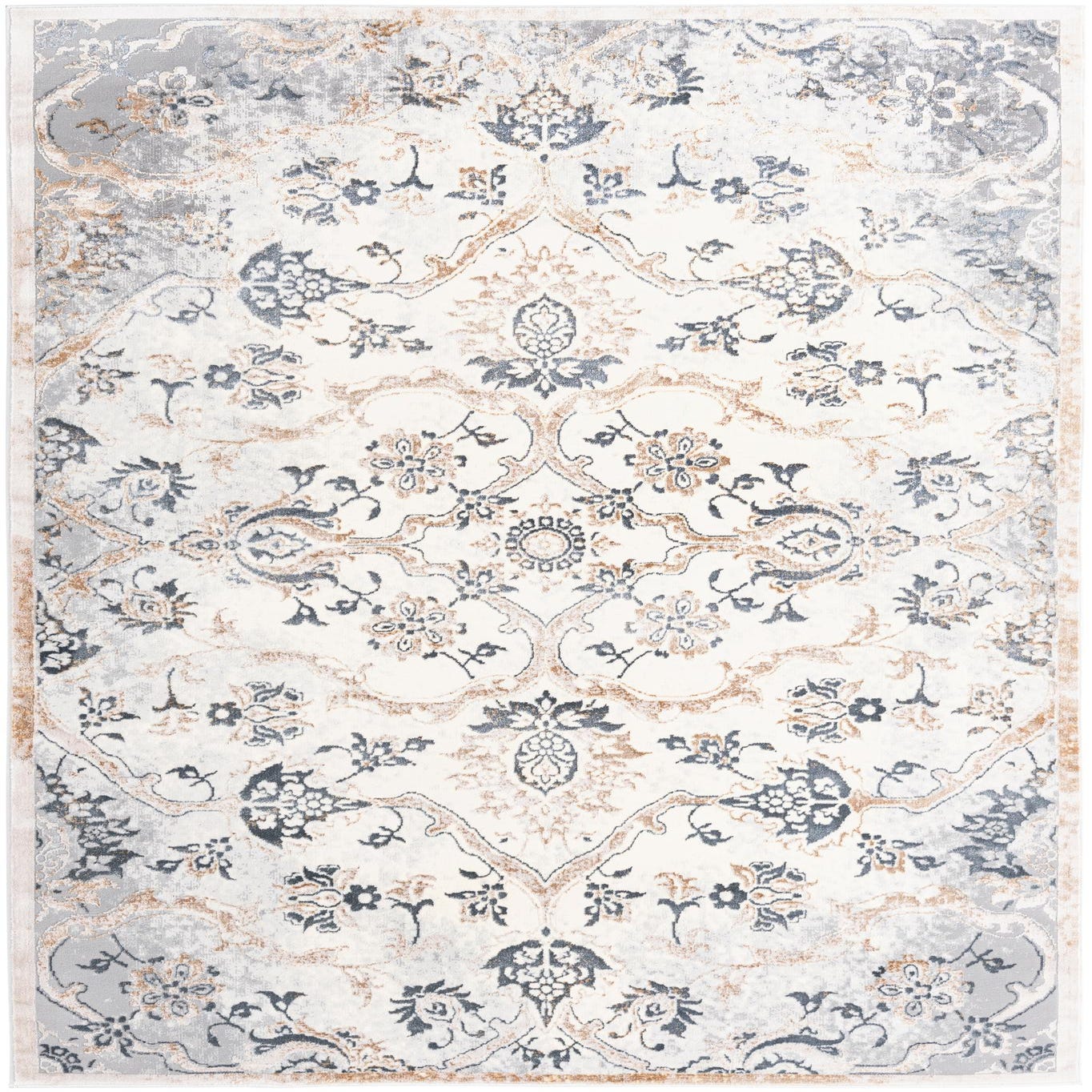 A 6x9 rectangular ivory, gray, and gold traditional area rug with a vintage floral medallion pattern.