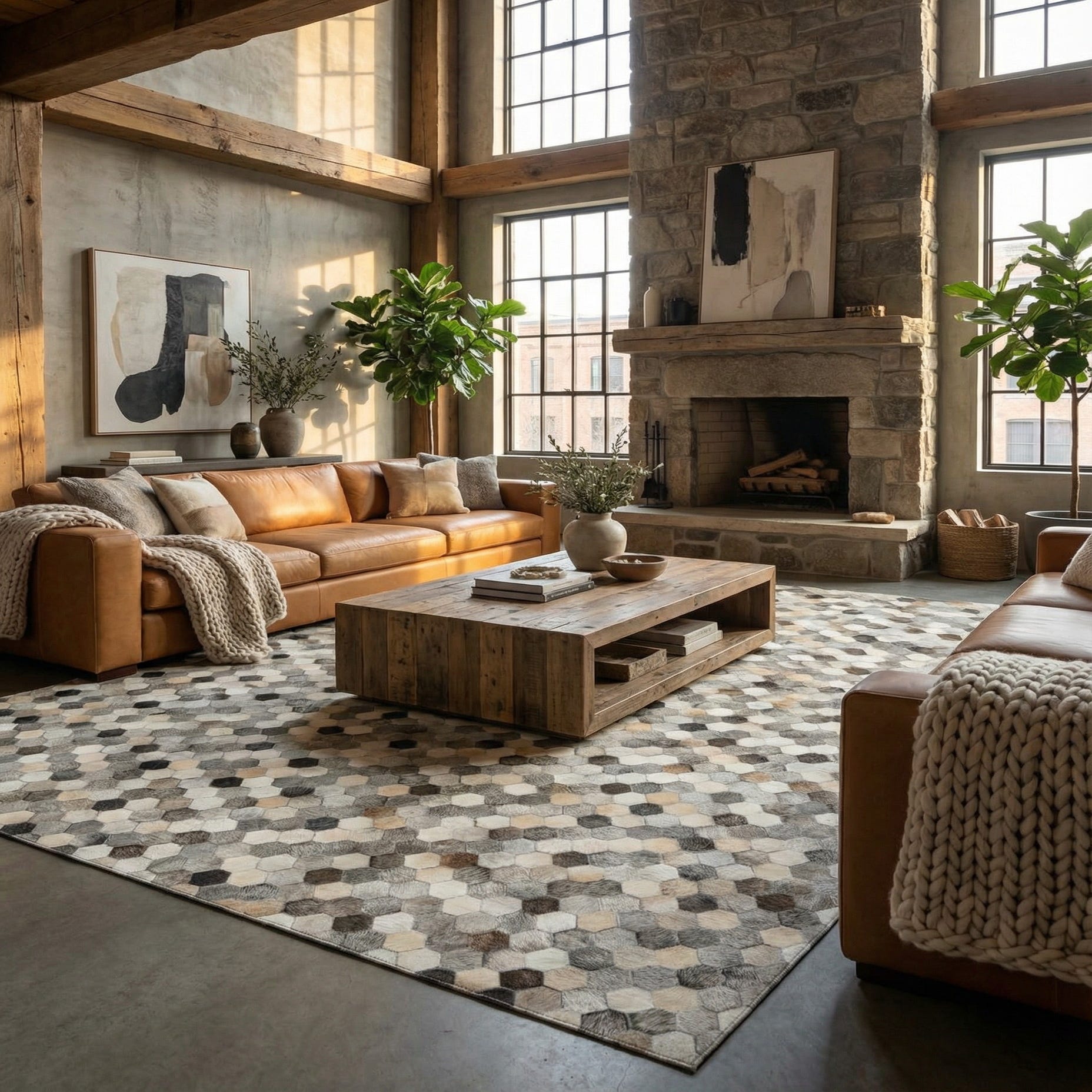 A tessellated honeycomb of small hexagon patches gives this hand made cowhide and leather rug a distinctive, graphic pattern with a natural, grounded presence. The Ivory Gray background provides a soft, neutral base while individual hexagons carry a palette of cream, warm beige, taupe, charcoal and brown, creating gentle contrast and visual movement across the surface. The hair-on-hide patches offer a subtle nap and variation in sheen, and the stitched leather joins give the rug a tactile, artisanal feel underfoot.