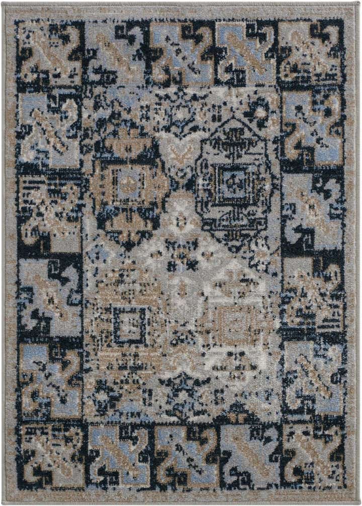 Primary color is Ivory Gray Blue. Colors in this rug include: Ivory Gray Blue, Beige, Light Blue, Navy Blue.