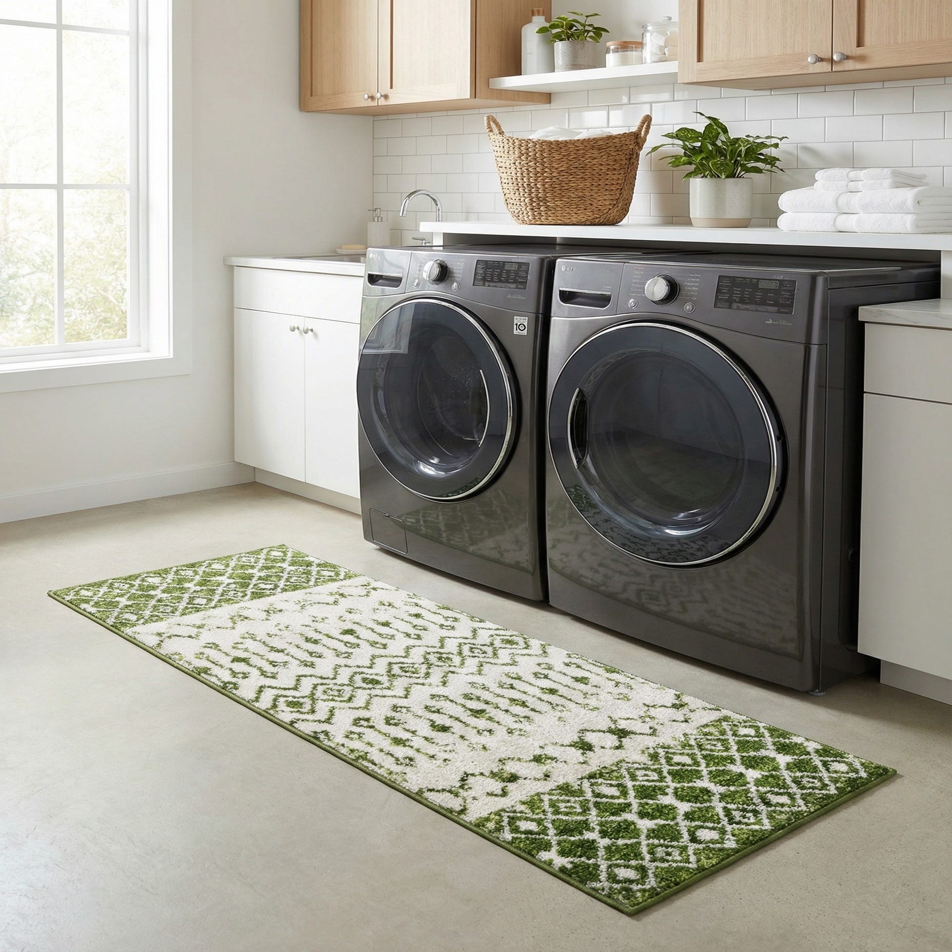 Place this runner in a bright entry, down a narrow hallway, or alongside a kitchen island to add color and pattern underfoot. It complements warm wood floors, white or pale cabinetry, and natural accents like rattan or woven baskets, and works well in transitional, modern farmhouse, or relaxed bohemian interiors where a touch of green ties together plantings and textiles. The scale and directional pattern make it an effective pathway piece for connecting rooms or anchoring a small seating nook.