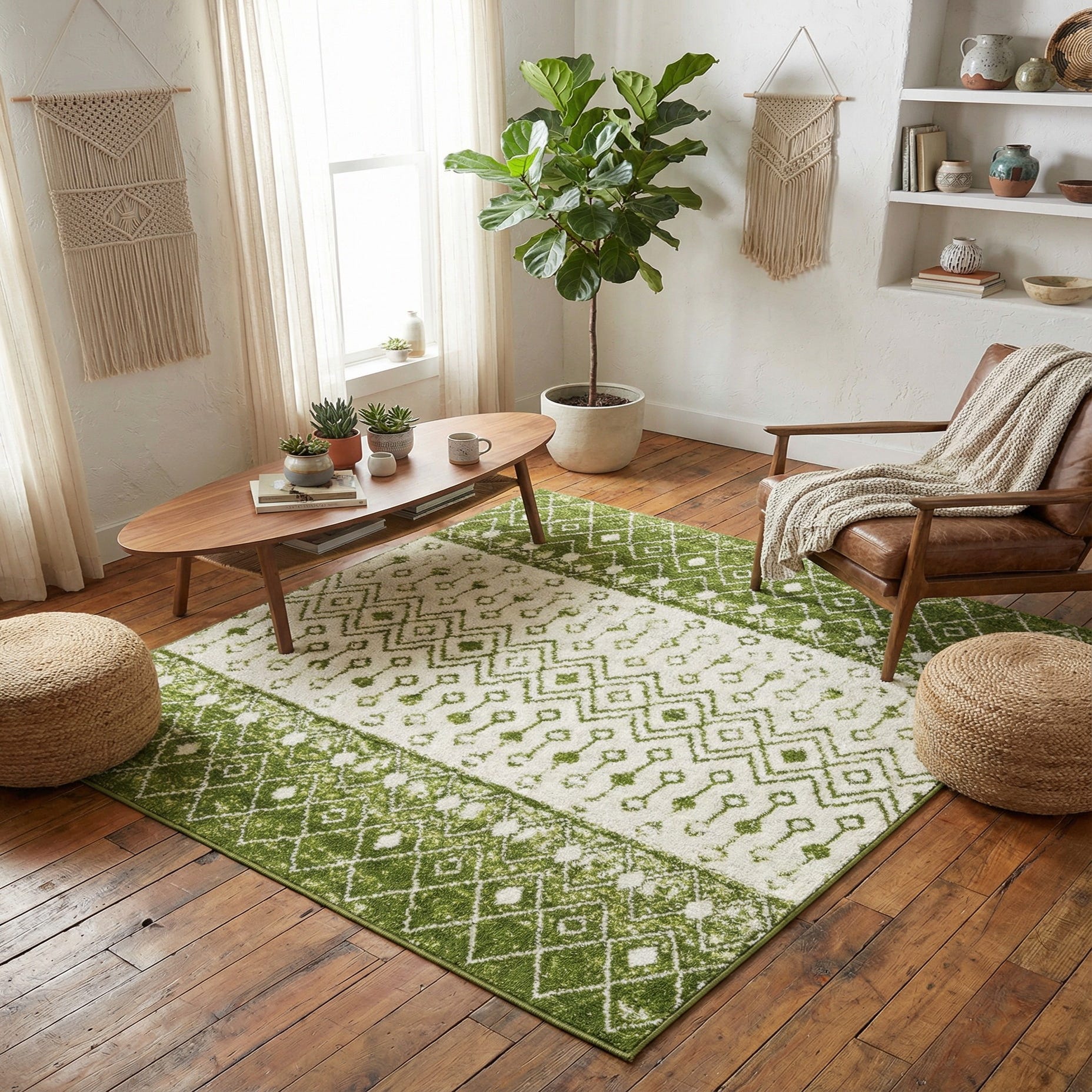 Machine-made of polypropylene, the pile has a soft, slightly lustrous hand that feels cushioned underfoot and shows subtle variation where the pattern is defined. Place this rug under a coffee table in a relaxed living room, anchor a cozy reading nook beside a planted corner, or add pattern and color to a bedroom with neutral bedding and light wood furniture. It pairs well with mid-century modern frames, natural textures like rattan and linen, or a crisp white sofa to let the green and ivory palette stand out.