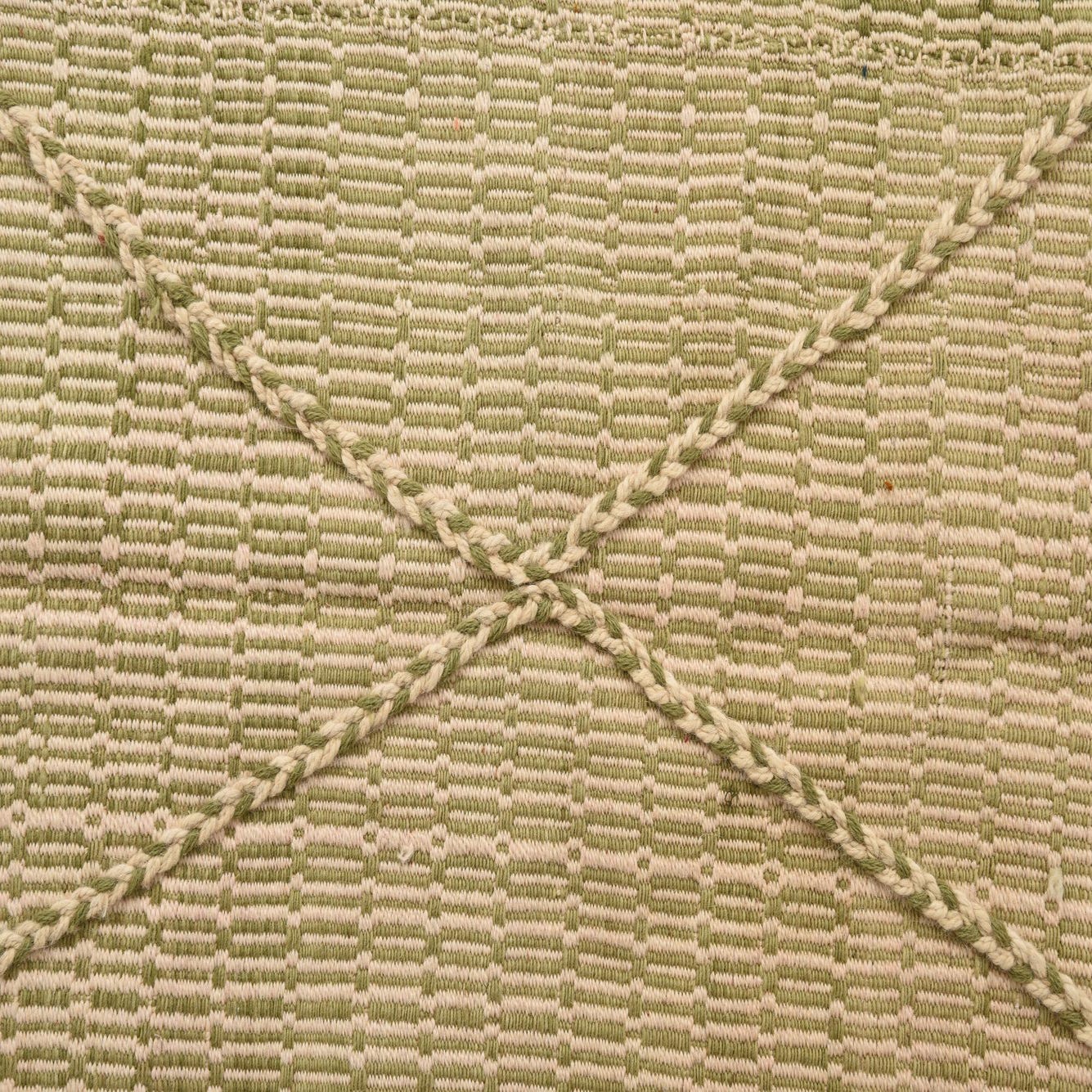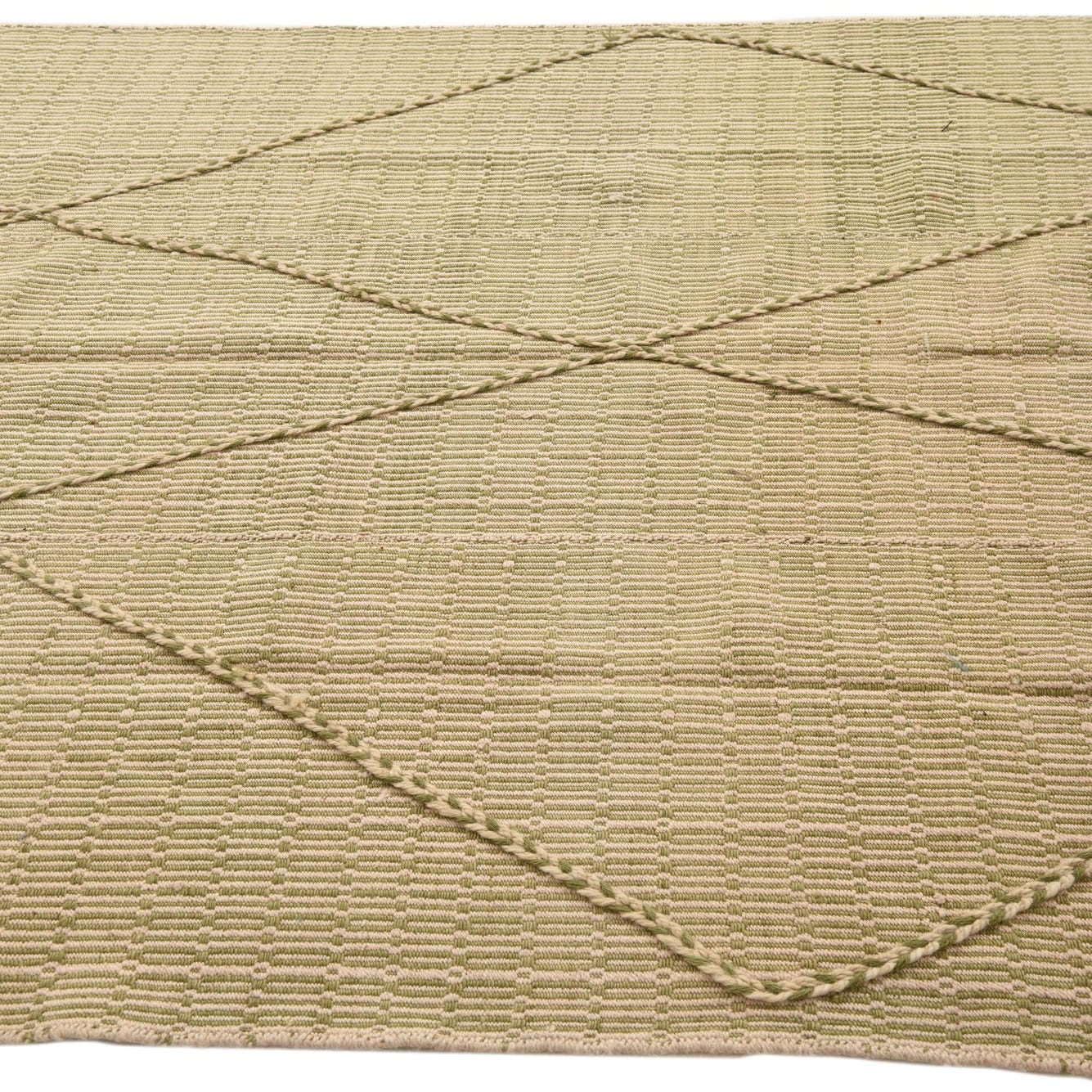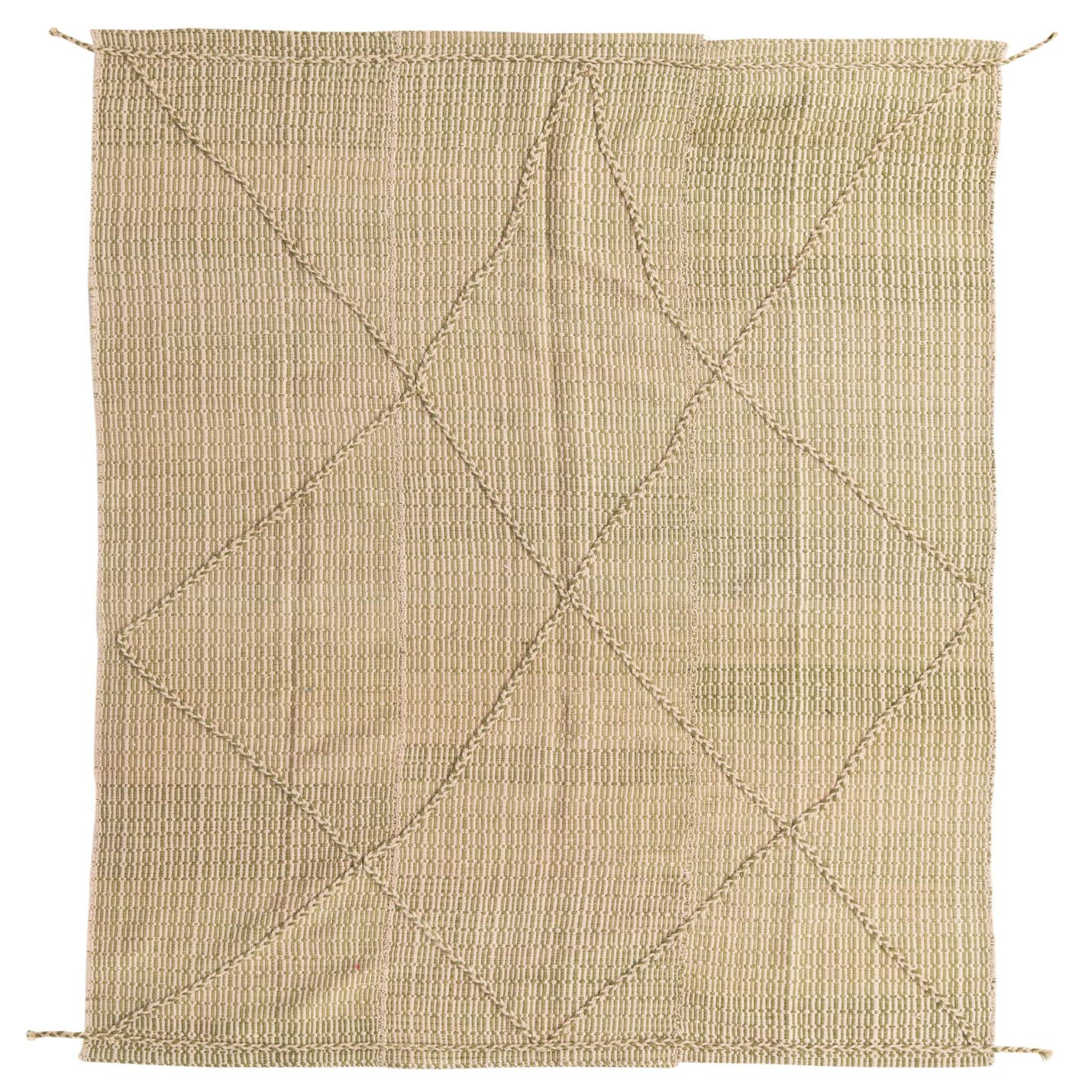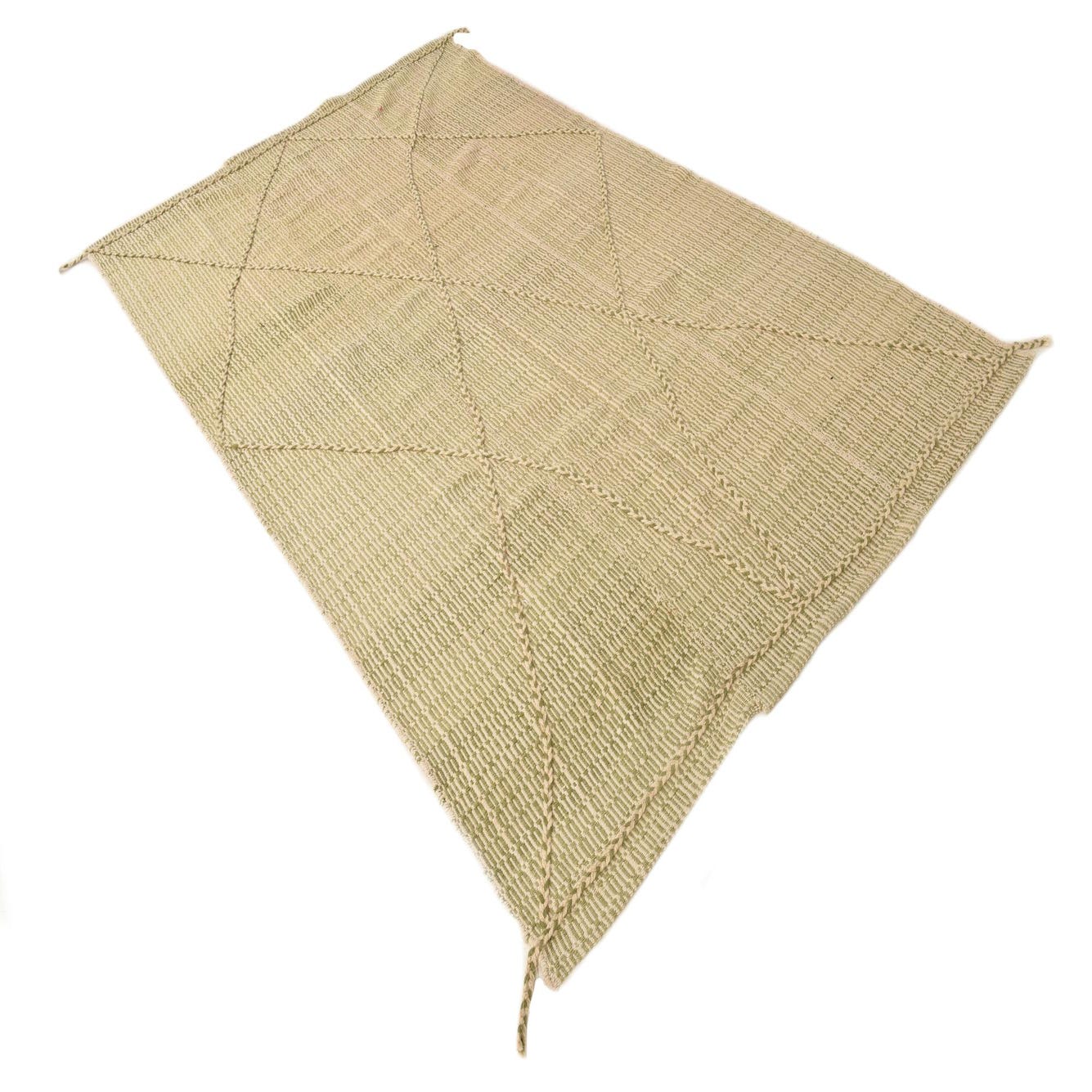 A 6x9 rectangular ivory shag rug with a subtle green tint and a tribal diamond pattern made from braided wool.