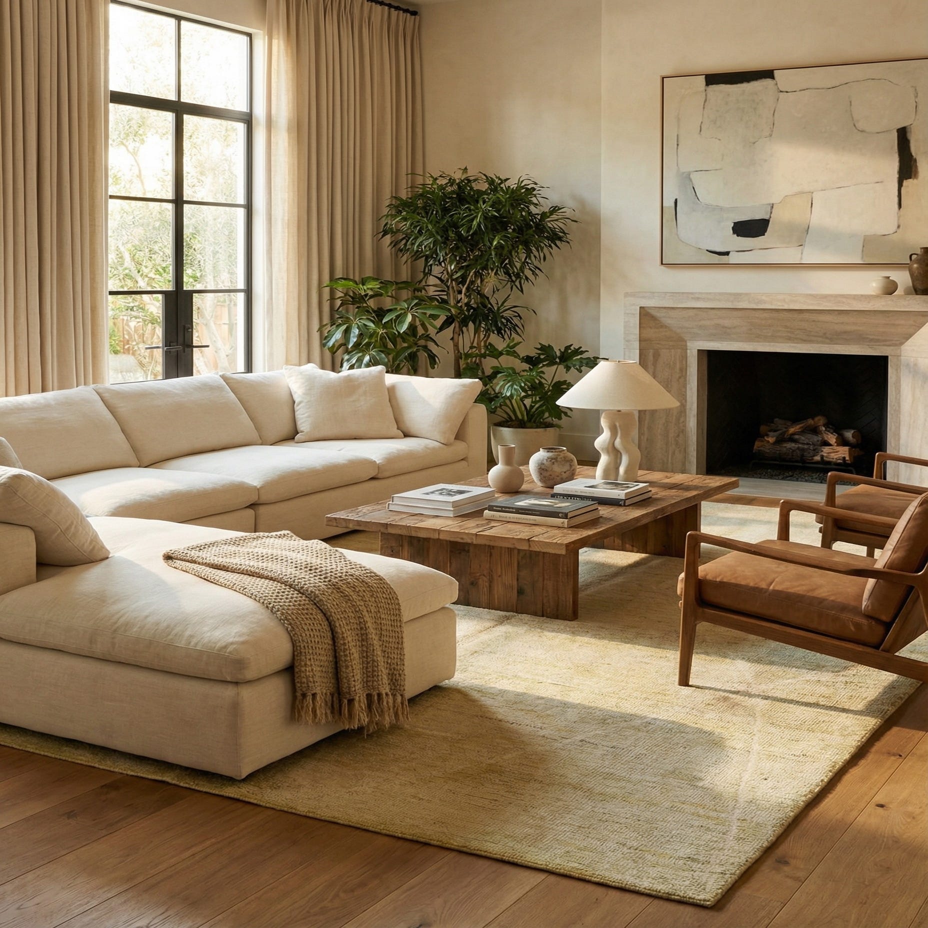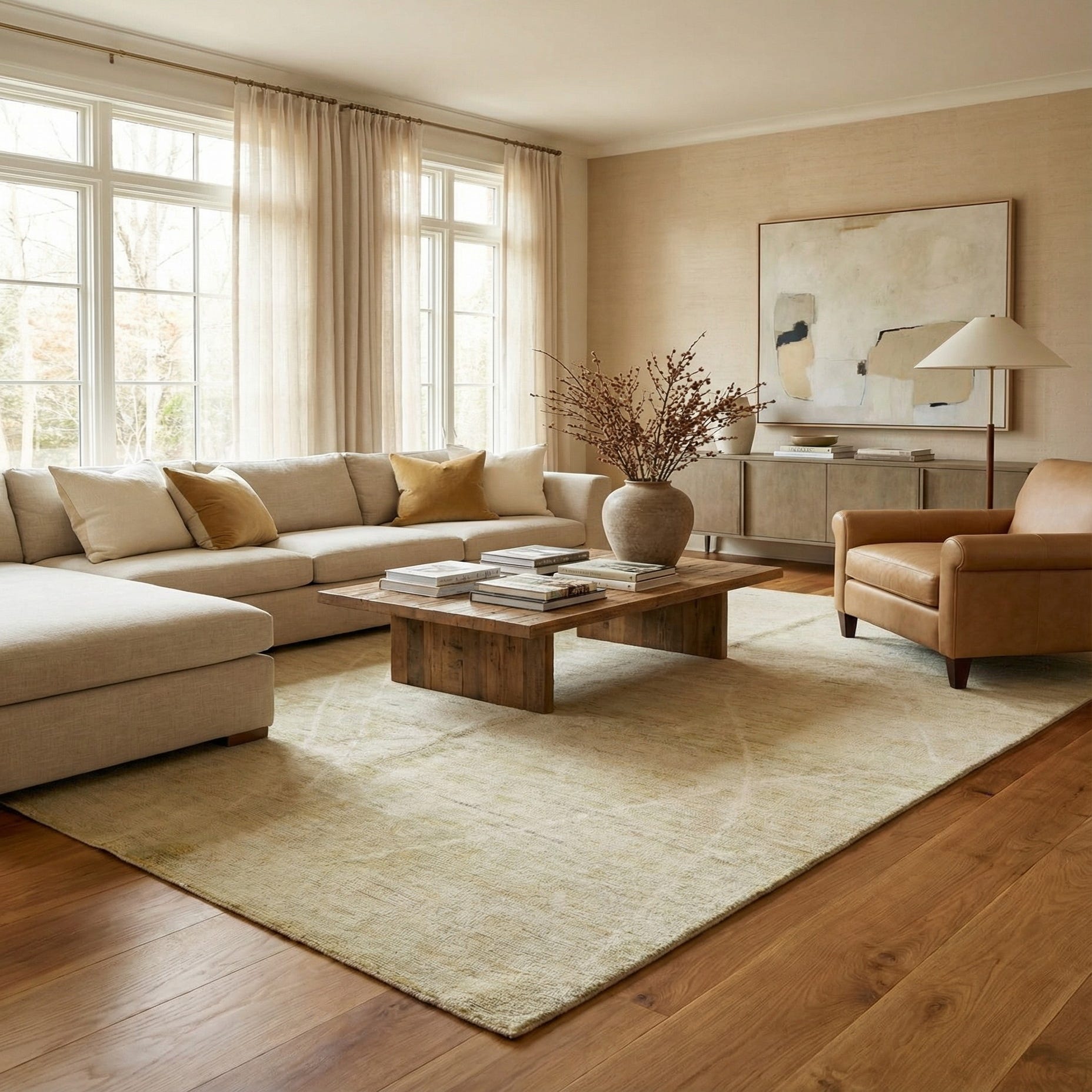 A 7x10 rectangular Darya rug with an ivory and cream base, featuring subtle green abstract patterns, perfect for a modern living room.