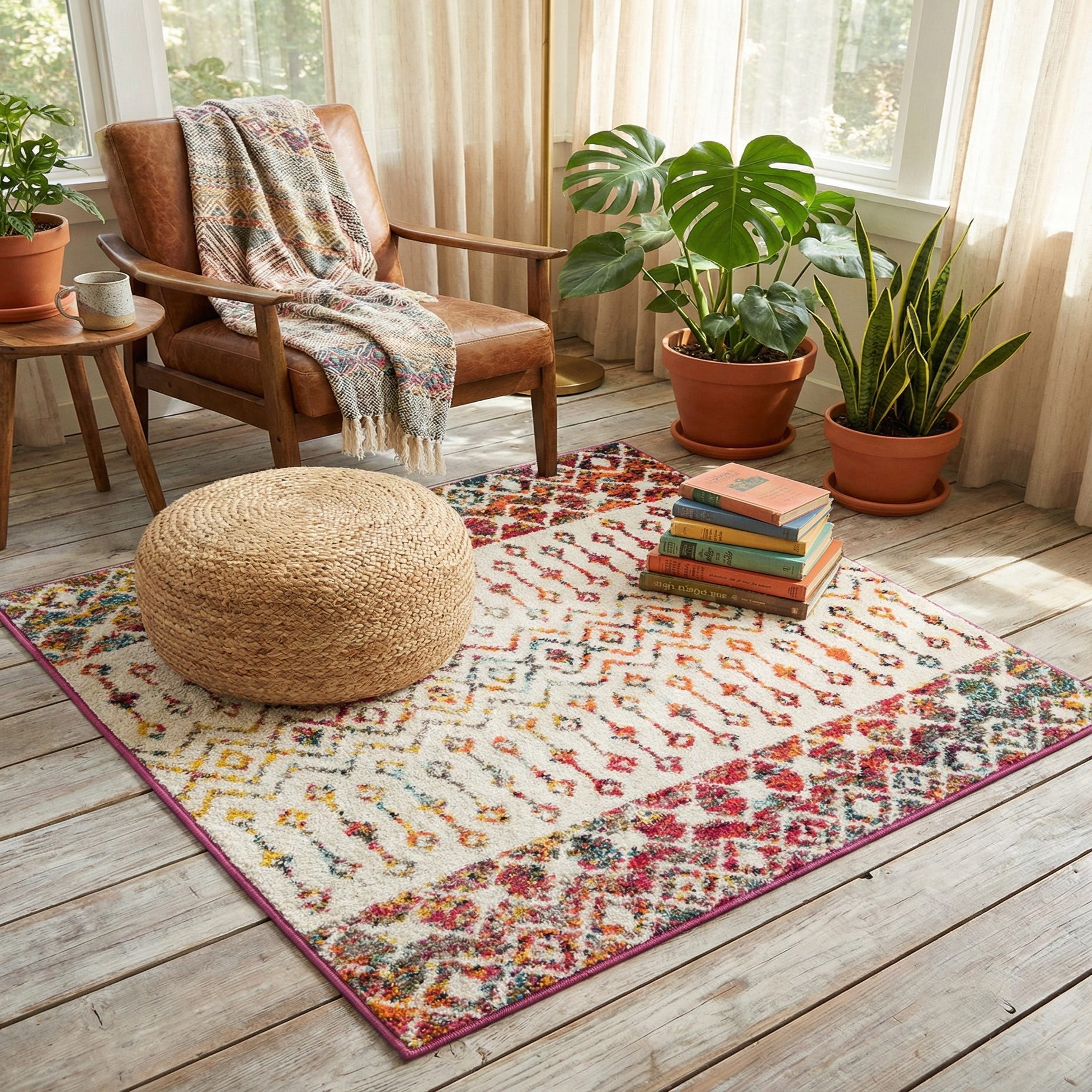 The rug's dynamic color scheme and 3 ft square dimension make it a versatile piece for a variety of interior design scenarios. It could serve as an accent in a minimalist space, bringing a pop of color and pattern without overwhelming the aesthetic. It complements well with contemporary, bohemian, or eclectic decors, and can also be integrated into a more traditional setting to add a touch of modern flair. This rug will brighten up small spaces like entryways, bathrooms, or kitchens, and can also be used as a statement piece in larger rooms with its lively and engaging pattern.